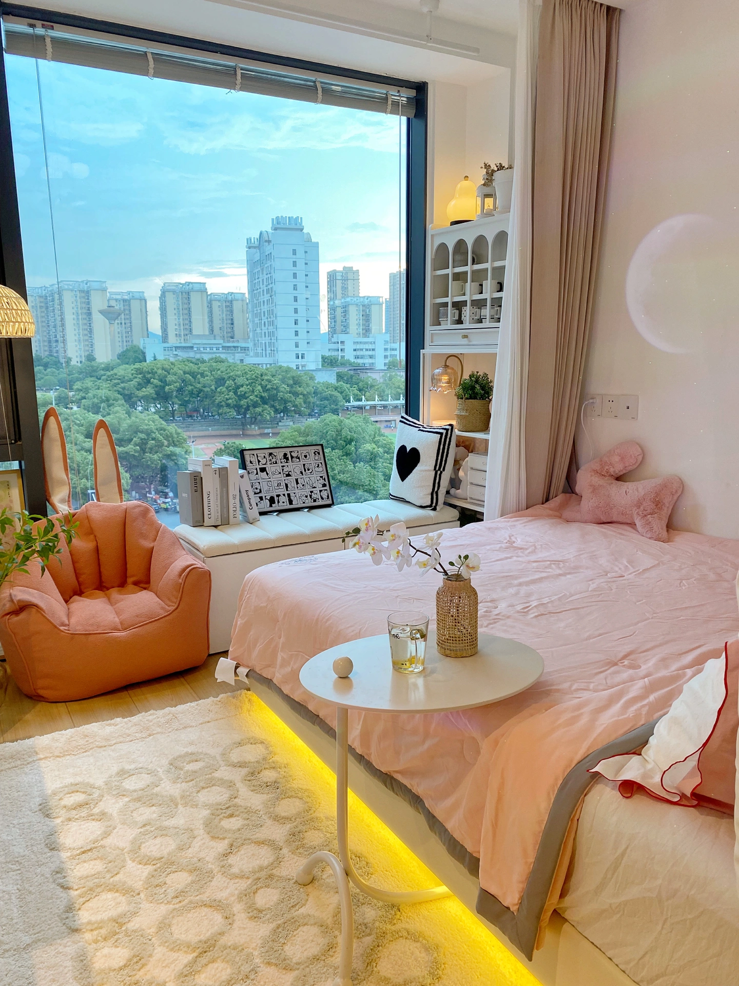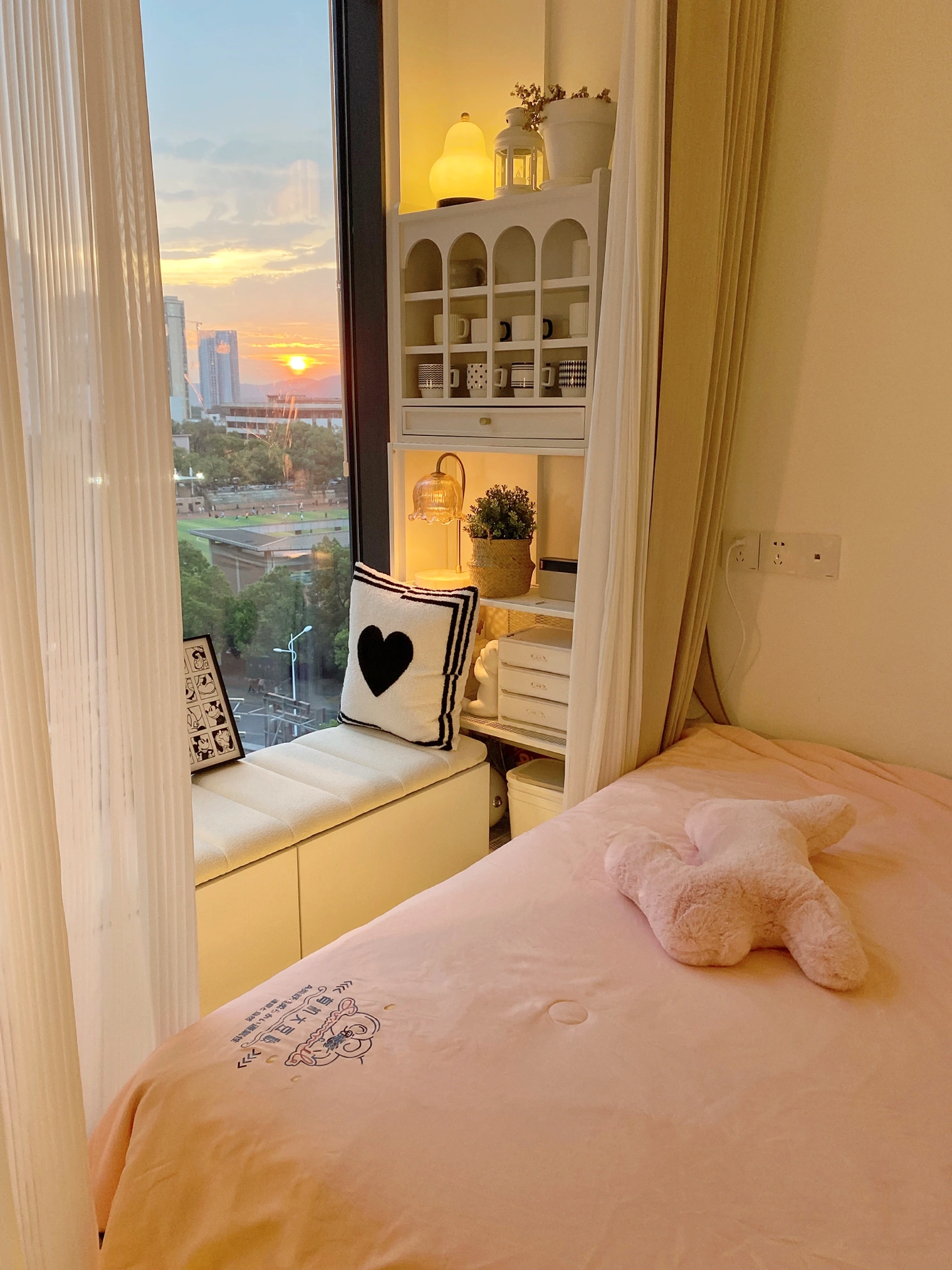 hello~欢迎回到你的网上小家 建面38平套内25平的小房子 粉粉的家好温柔啊 黄昏总爱坐在飘窗垫上看窗外 今天的夕阳好美~