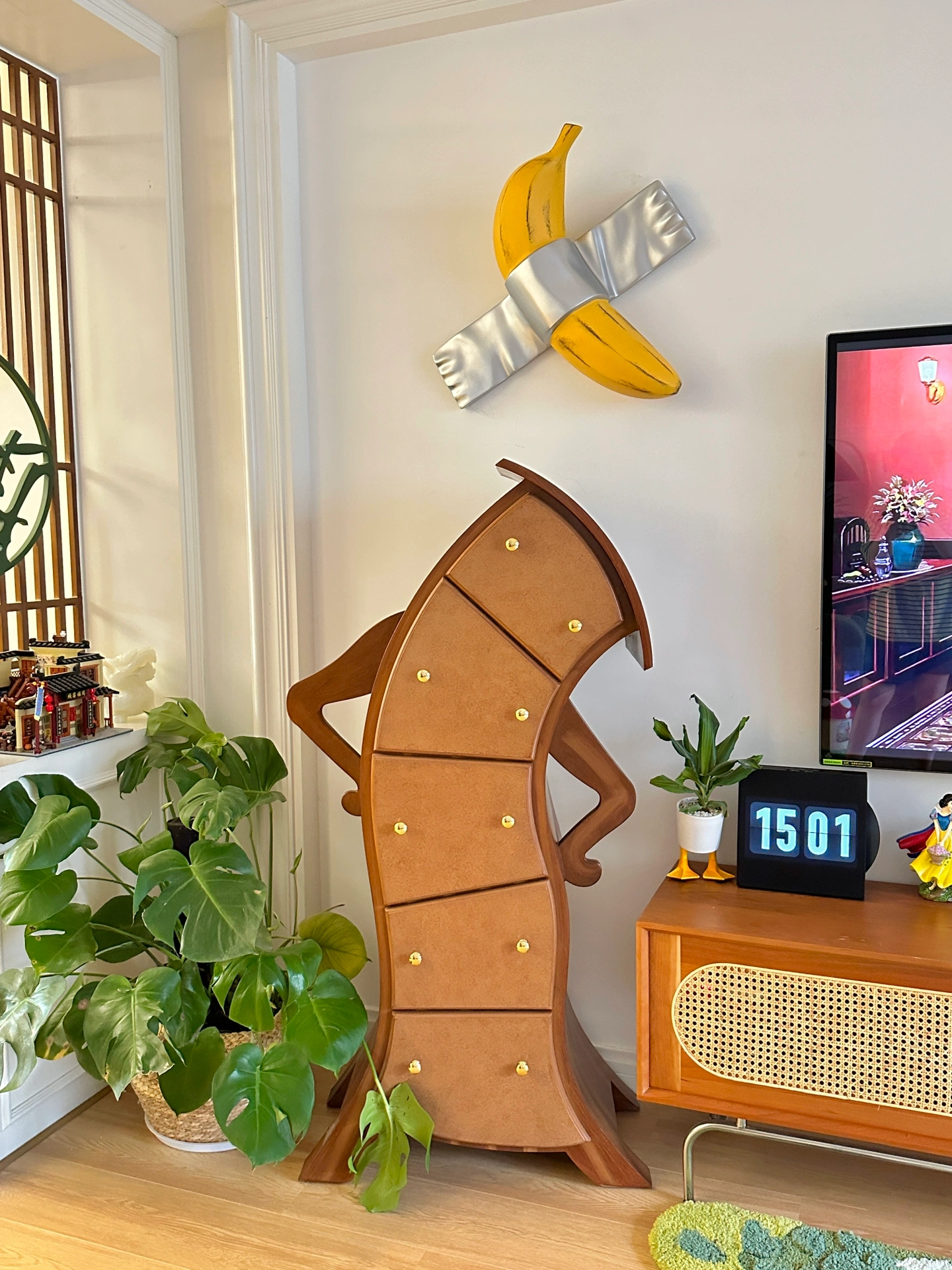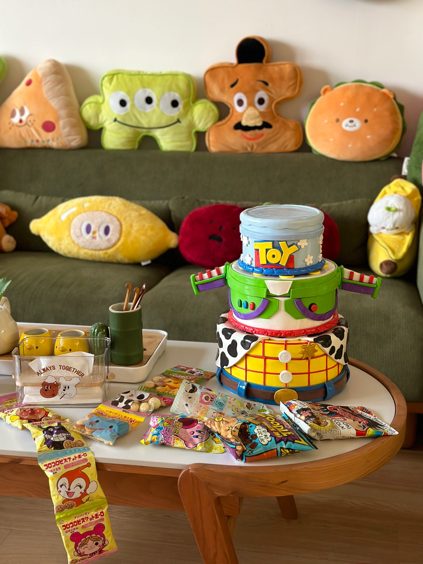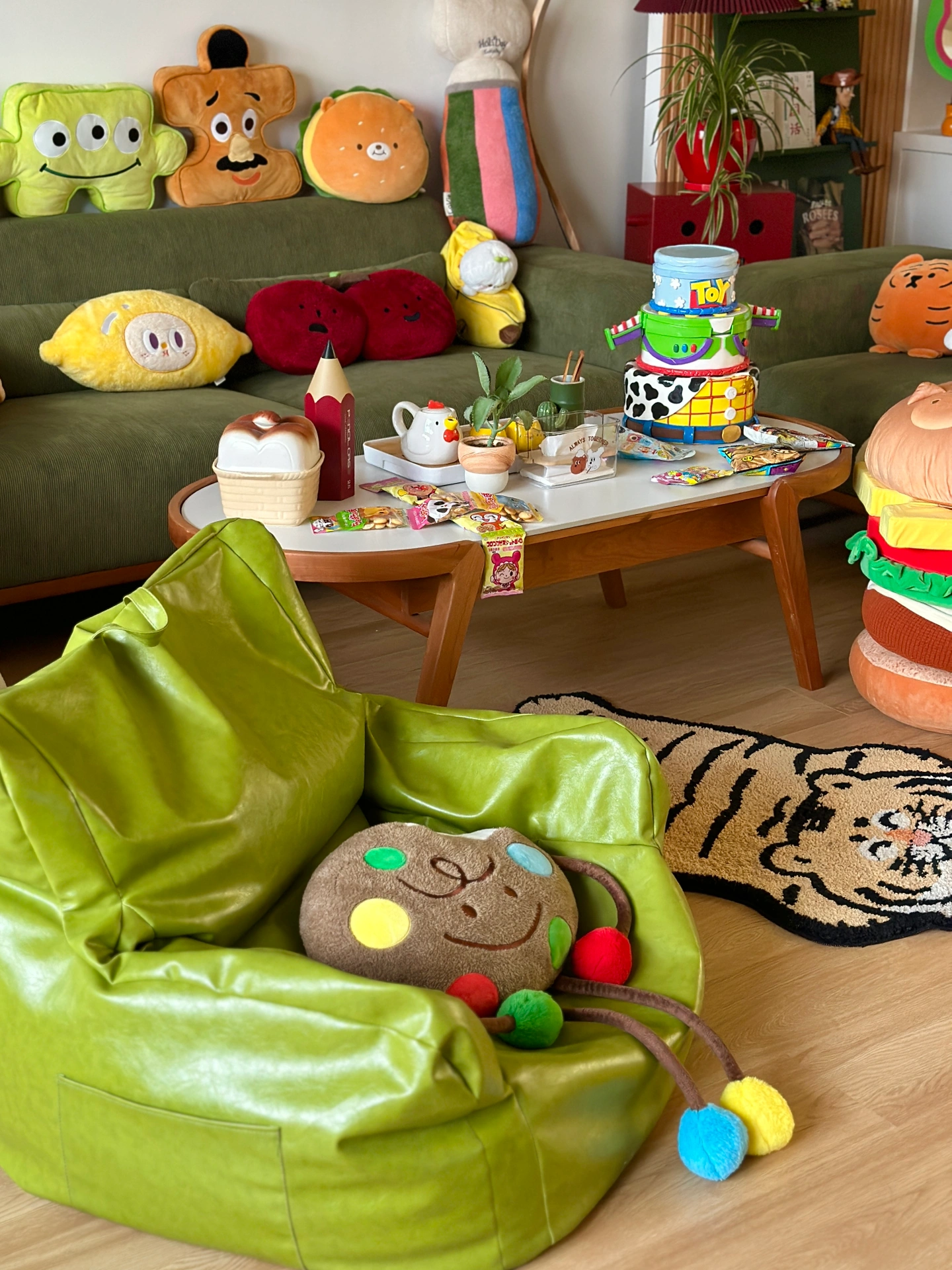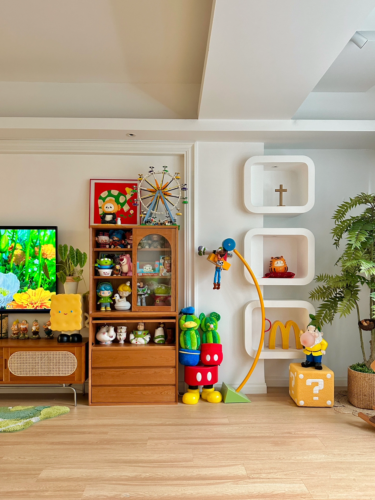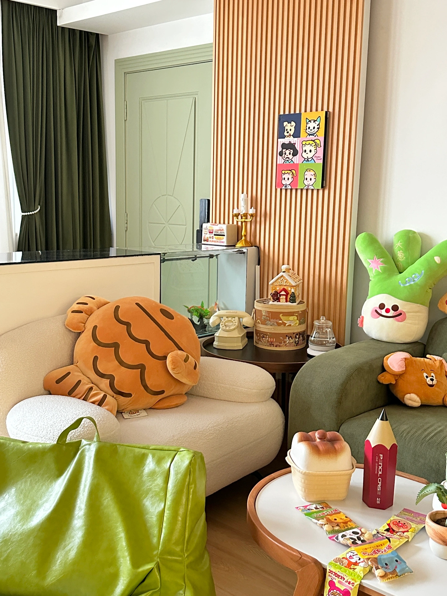 我妈说我简直把自己当小朋友养 不是在买玩具就是在拿玩具的路上😂 家里的沙发被玩偶坐满了,家里简直是个玩具城 客餐厅通铺浅色木地板,主体色系以深浅不一的绿色和白色为主,混搭各种稀奇古怪的可爱家具! 谁说原木风不可以童趣可爱呢~