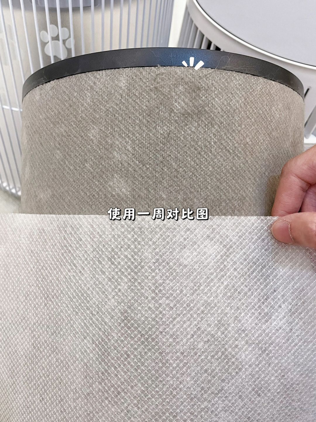 实际使用下来,对浮毛和皮屑尘埃的吸附能力也是肉眼可见的强!!刚开了不到一周,滤网就拦下了一层灰黑的脏东西!