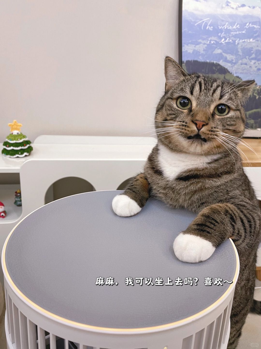 顶部的凹型设计据说是符合猫体工学的猫咪宝座[大笑R],还非常耐磨耐抓~饼子一上去确实是不愿意下来了...那就在上面罚它顶杯子好了!看它认不认错!