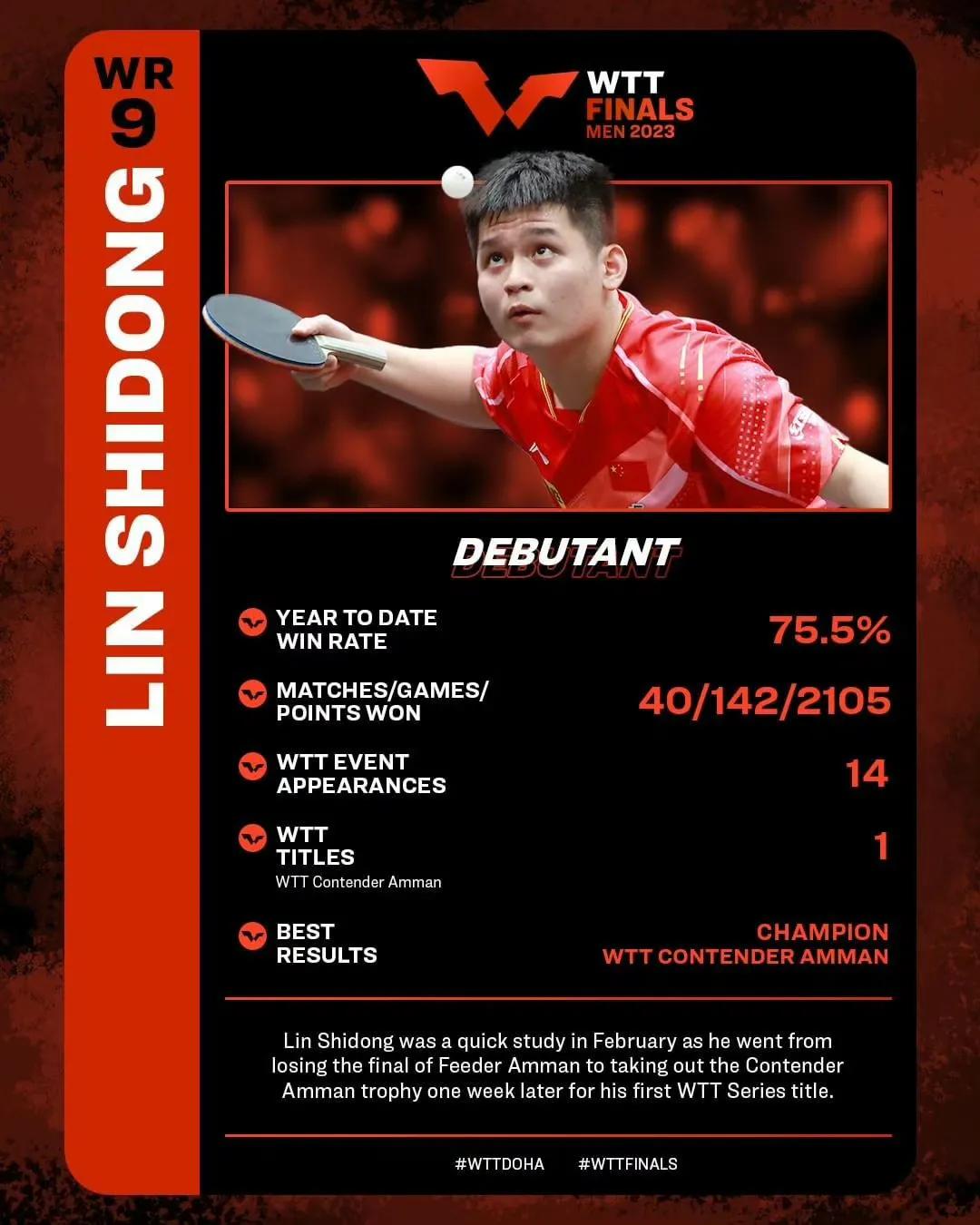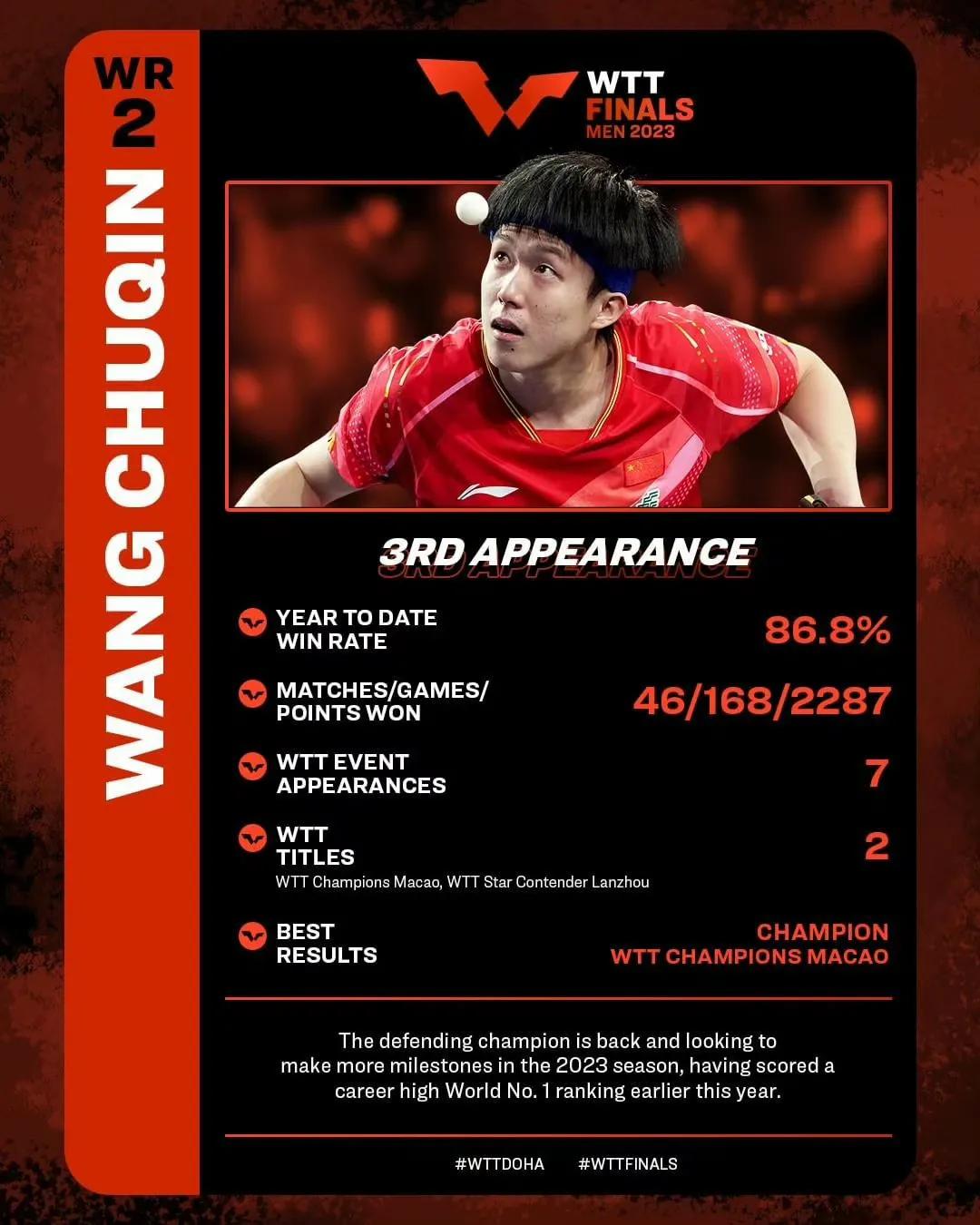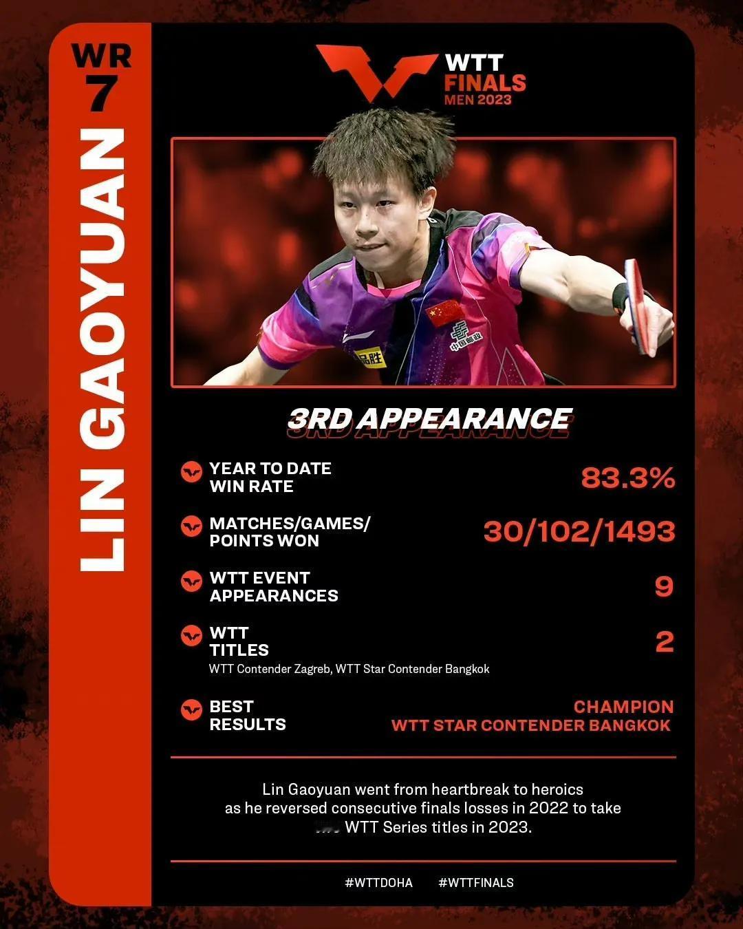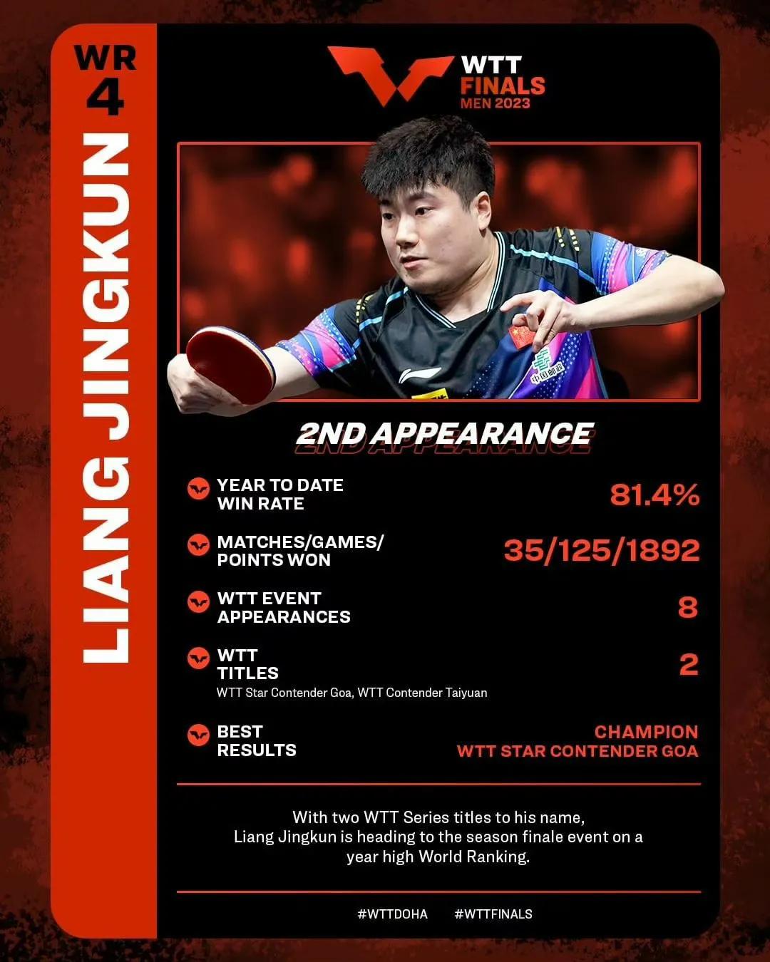 2023WTT多哈男子总决赛1月3日开赛,樊振东、马龙、林高远位于上半区。王楚钦、梁靖崑、林诗栋位于下半区,上下半区人数还是比较均衡的!国乒首轮对决每场都非常值得期待,尤其是王楚钦和勒布伦弟弟的对决,谁能更胜一筹? 本日赛程 16:00 梁靖崑🇨🇳🆚林昀儒(中国台北) 在23年11月的法兰克福冠军赛上林昀儒先后战胜国乒王楚钦、马龙夺得本站冠军🏆,大胖一定要做好困难准备! 16:40 林诗栋🇨🇳🆚邱党🇩🇪 林诗栋可谓是国乒的希望之星 17:20 阿鲁纳🆚雨果🇧🇷 18:00 樊振东🇨🇳🆚达科·约奇克🇸🇮 20:00张本智和🇯🇵🆚奥恰洛夫🇩🇪 20:40 马龙🇨🇳🆚张禹珍🇰🇷 21:20 林高远🇨🇳🆚安东·卡尔伯格🇸🇪 22:00 王楚钦🇨🇳🆚费利克斯·勒布伦🇫🇷 这是比较有看点的比赛,勒布伦弟弟是比较难缠的,打法快,想要参加巴黎奥运会,俩人交手是必须的!#多哈男子总决赛2023# #乒乓球# #中国乒乓球#