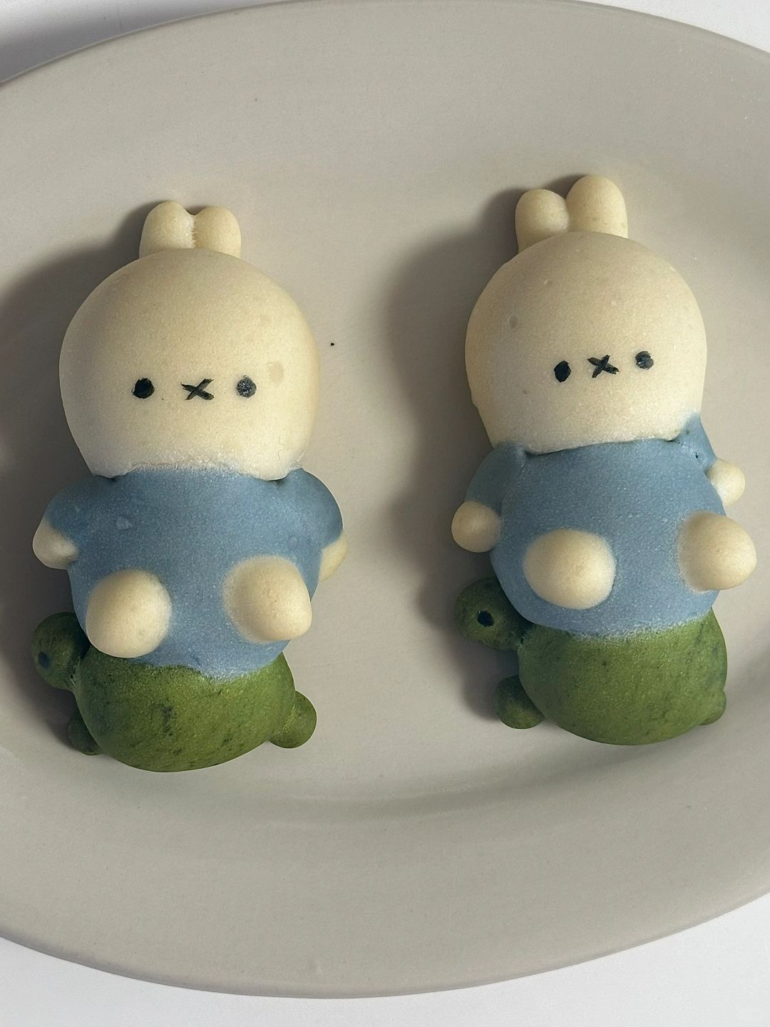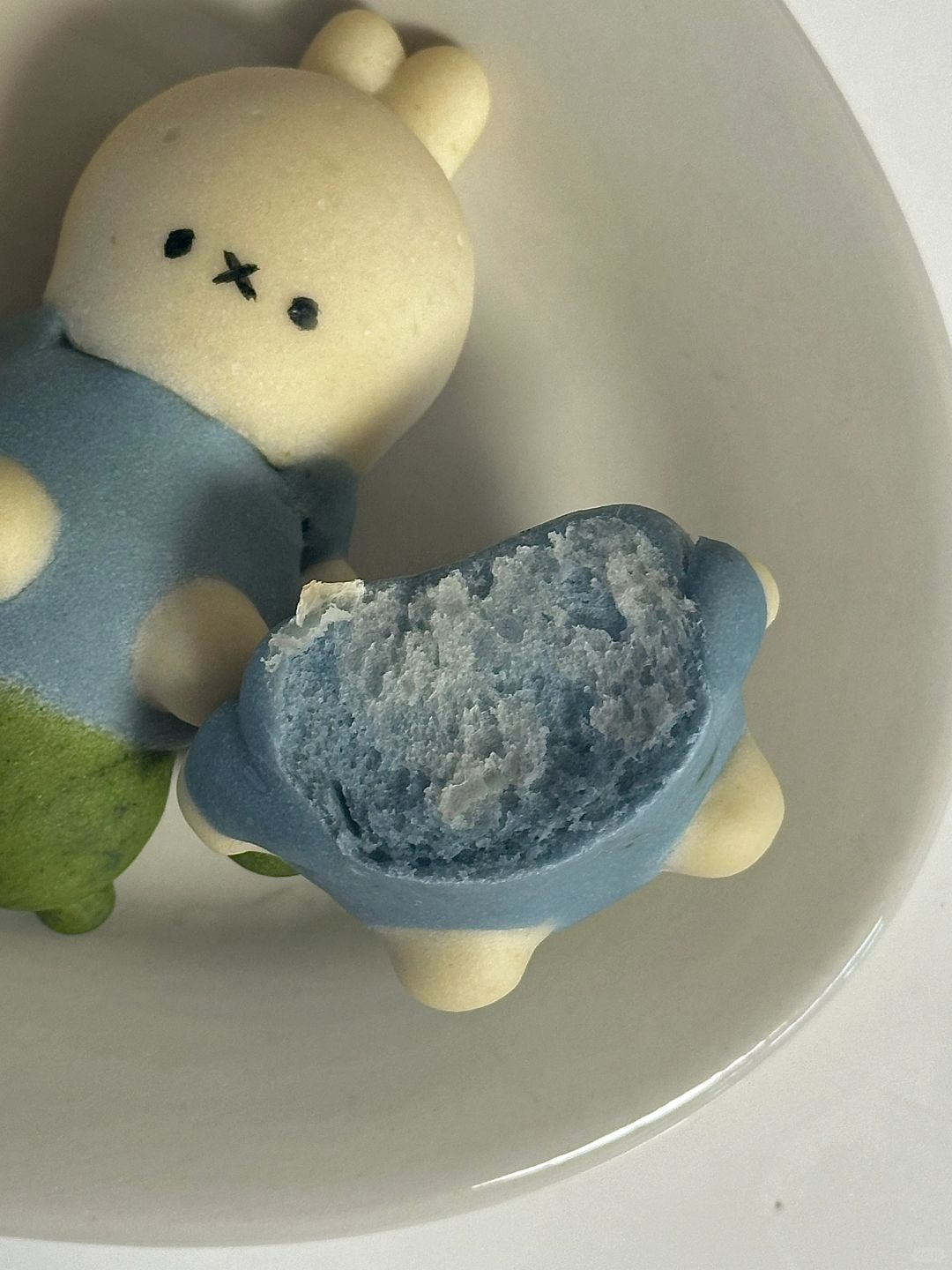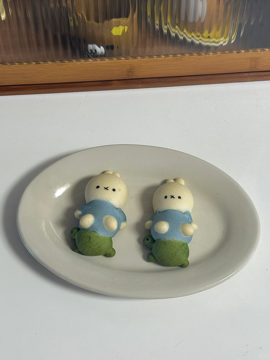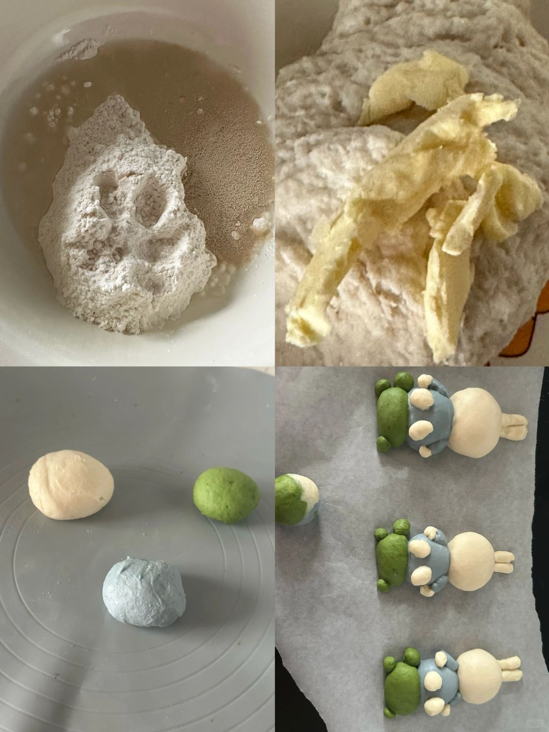 100g高筋面粉、62g水、10g糖、1g盐、5g黄油、调色(蓝色色粉、抹茶粉)