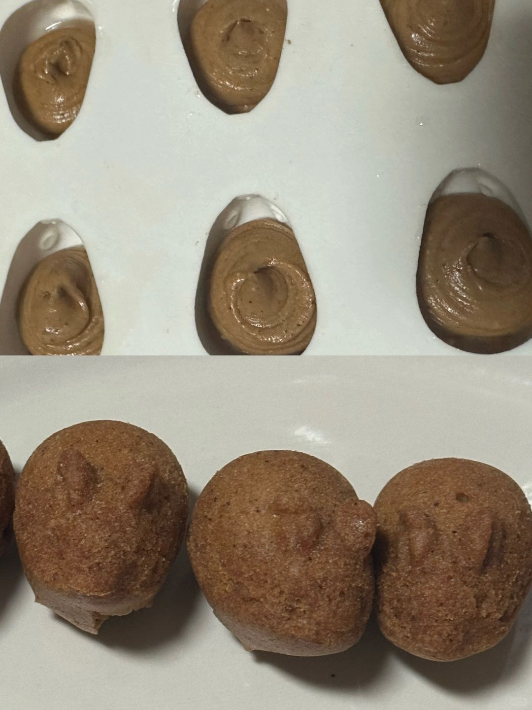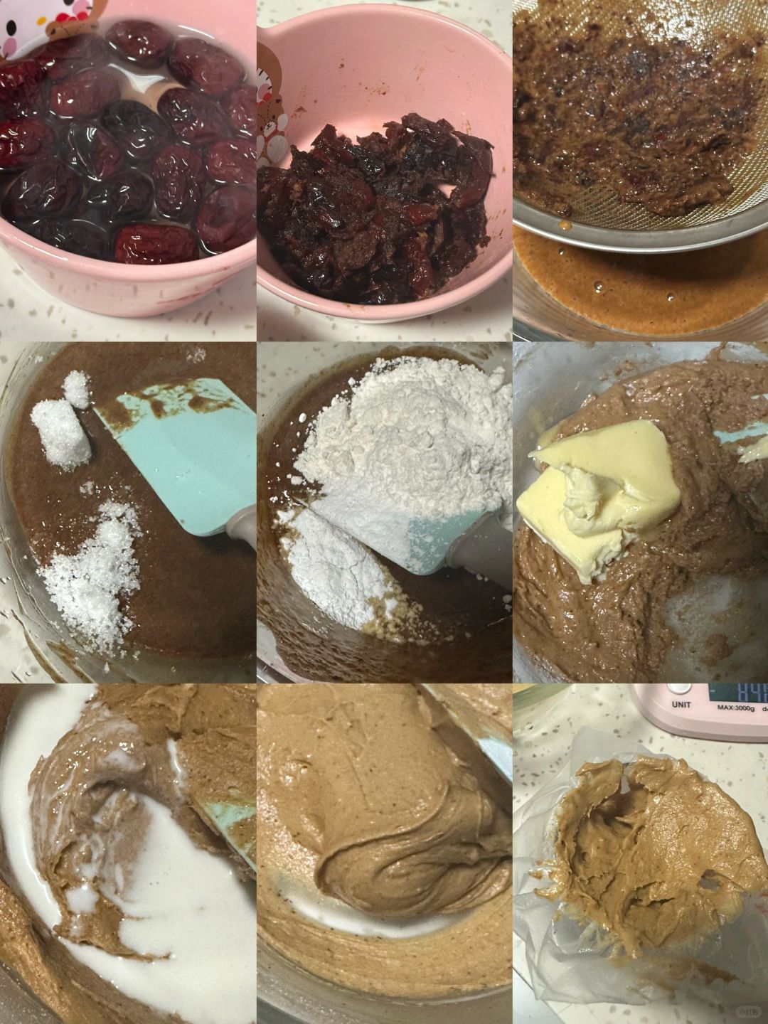 搅搅就成功! 配料: 55g干红枣、鸡蛋一个、10g牛奶、10g糖、20g黄油、50g低筋面粉、3g泡打粉 1.干红枣泡水后去核,和鸡蛋一起放入搅拌机打烂,过筛(不过也没关系,过筛后还剩下55g) 2.加入糖混合均匀,再加入粉类混合均匀,最后加入软化或融化的黄油,如果很干就加点牛奶兑一下 3.蛋糕糊装入裱花袋挤入模具(模具提前刷油,蛋糕糊挤6分满) 4.190烤12分钟(仅供参考)