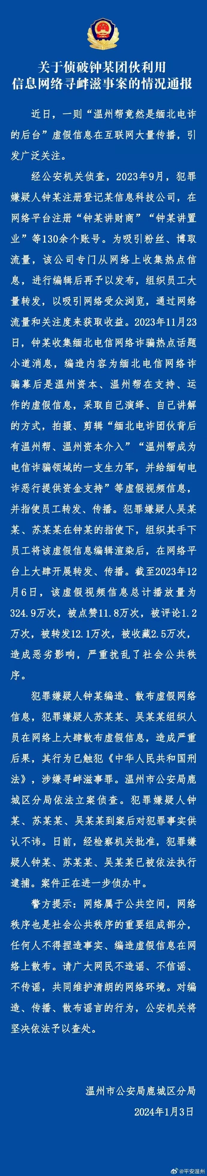 #警方辟谣“温州帮是缅北电诈后台”#面对这种地域黑,确实短期可以博得流量,但是怎么可能不会受到打击呢?温州警方真的出手了,抓获了营销号背后的控制人钟某,以及另外两名主要犯罪人员,以寻衅滋事罪进行刑事拘留。
