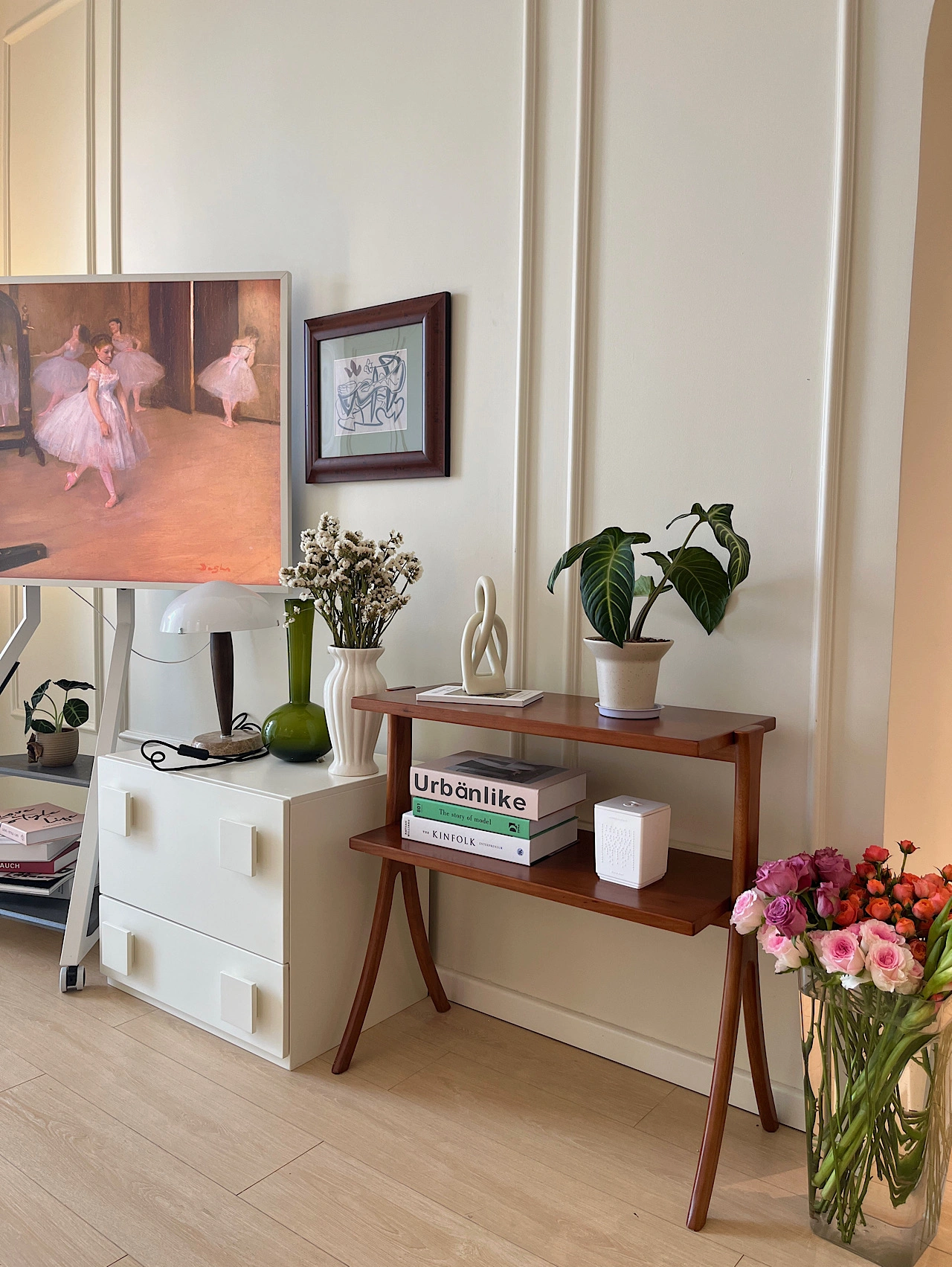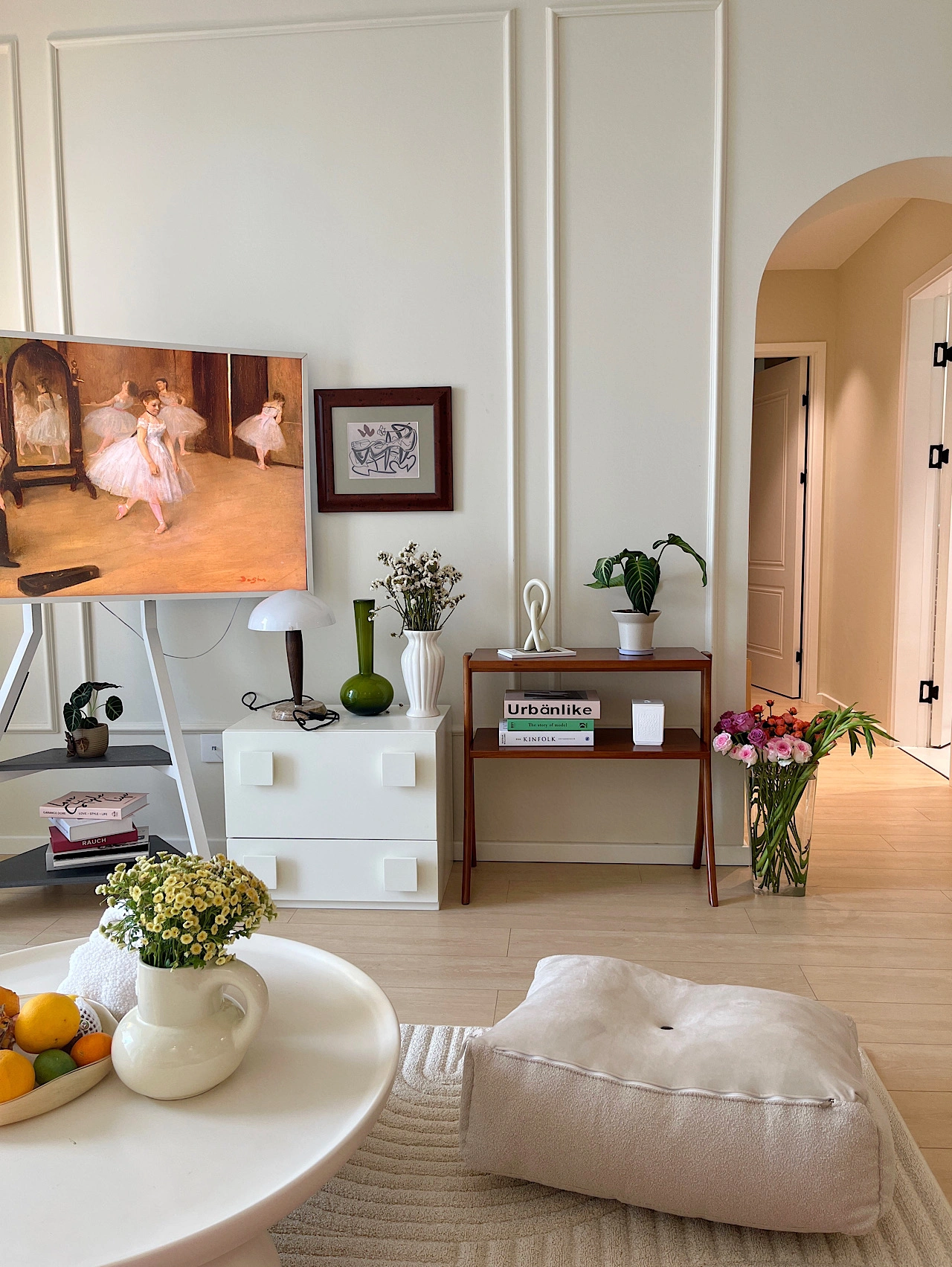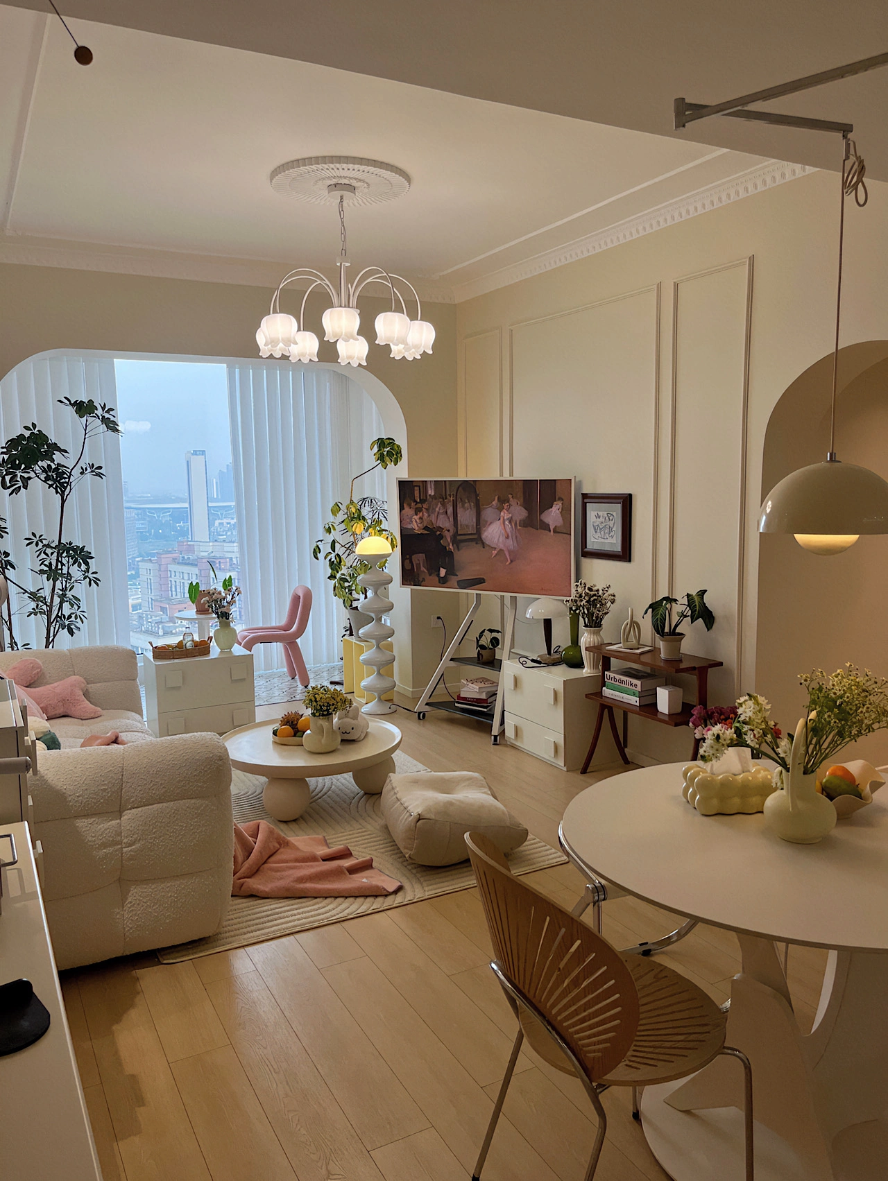 常常被你们夸家里好看 几乎是你们梦想其中的房子了 每次都很开心在这里跟你们分享~ 25岁靠自己装修住进了我的Dream house! 把普通的生活也能过得浪漫有趣 今天给大家分享下我家的整体情况💡 建筑面积:83平~ 套内面积:65平 两室一厅一卫一开放式厨房 整体风格奶油轻法式 关于我家客餐厅🟠 完全是靠软装撑起来的家,客餐厅一体设计 ▪️简单乳胶漆墙面➕石膏线.pu线条装饰,法式气息满满,色系以奶油色系为主,融入少量局部低饱和色彩点缀其间,空间温柔丰富,满而不乱 ▪️大件家具色系统一,我家沙发、餐桌、包括柜子、茶几都以奶油色系为主,大的视觉层次是温馨舒适的,局部搭配木色中古置物架和一些中古元素的装饰画、摆件等,让整个家更加丰满 ▪️灯光是氛围感利器,我家主灯还是选择耐看的白铃兰吊灯,简单耐看,开灯氛围感十足,搭配局部辅助光源,家的感觉瞬间被点亮了~ 关于主卧🟠 ▪️卧室的风格很多变,近期把卧室改造成了法式复古风,柔软的四件套搭配复古装饰画和法式地毯,空间瞬间变得不一样,纯粹的奶油风看腻了,可以试试哦~卧室瞬间法式感满满~ 我始终热爱在家居布置上获得幸福感 坚信通过一点点细节都能使家里变得更丰满❤️ 希望你们喜欢~