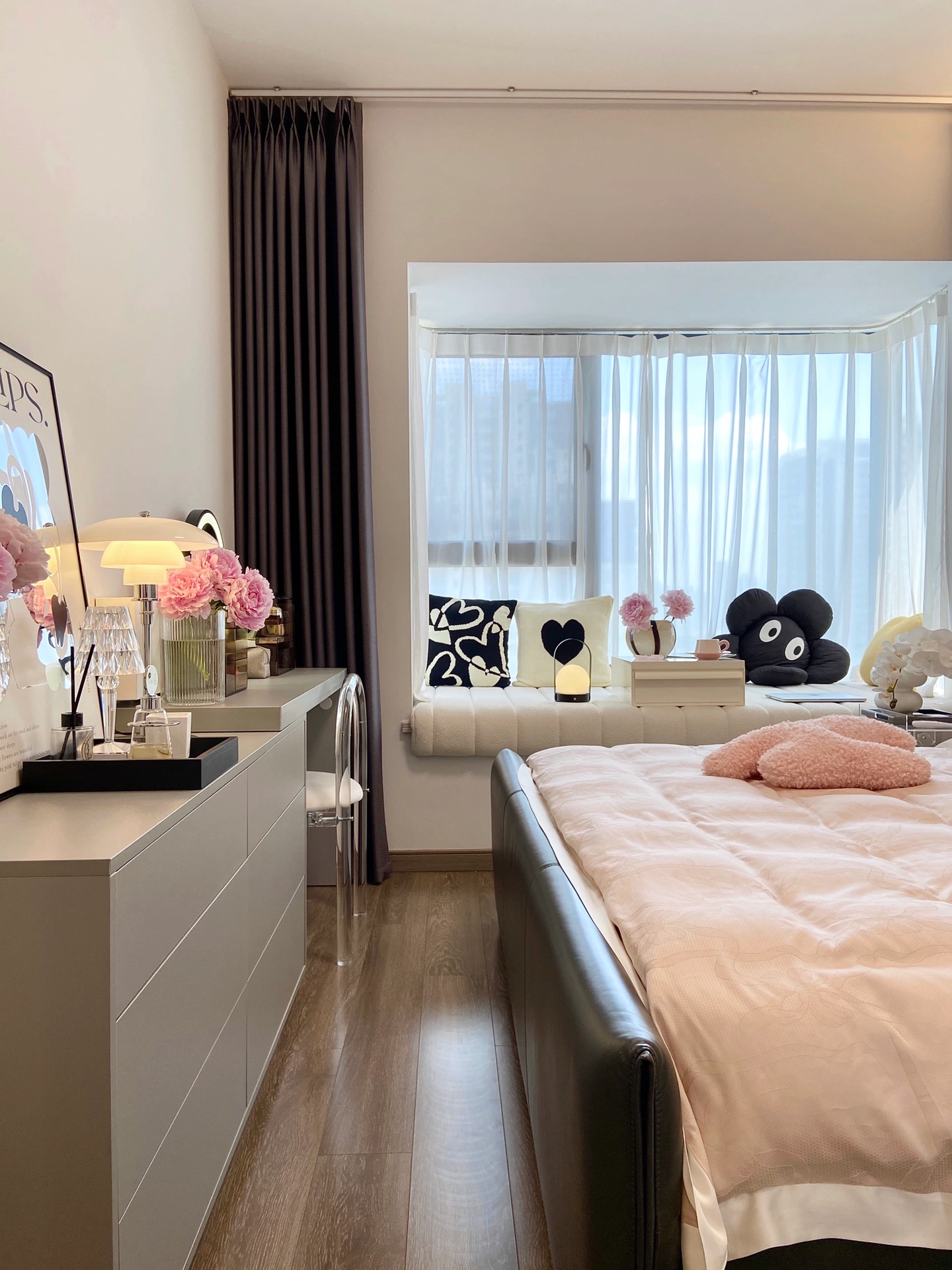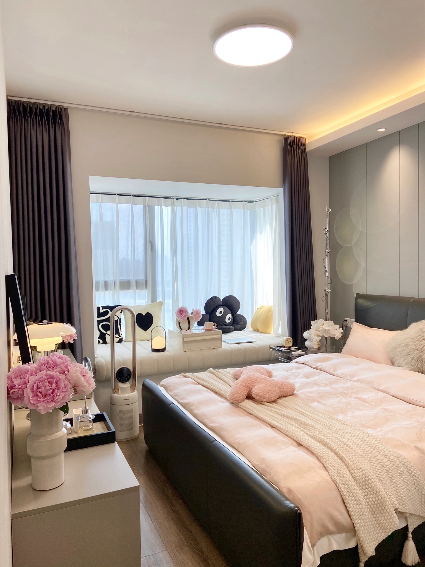 🏠房本面积126,套内100平,四室两厅两卫一厨 精装房拆改,全屋软硬装落地12W 全屋以50%⚪+ 30%🟤 +20%⚫为基础色,配上有饱和度的软装、绿植和鲜花,整体是温馨调的现代简约风 ▫没用墙纸或壁布,全屋通刷乳胶漆 ▫客厅阳台没包垭口,用直角条收边,横平竖直也很出效果 ▫选用800×800小规格瓷砖,用接近颜色的亚浅灰美缝,缝隙隐形又省钱 ▫电视背景墙是用石膏板做造型框,再刷乳胶漆,一千多就搞定啦~ 自从搬进新家,真的完全不想出门啊,不知道有没有宝跟我一样