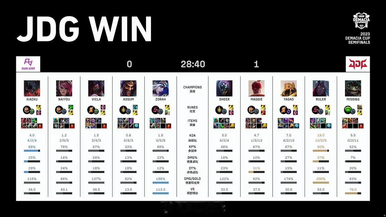【#2023德玛西亚杯# RA 0-3 JDG】 双方赛后数据如下,你怎么评价