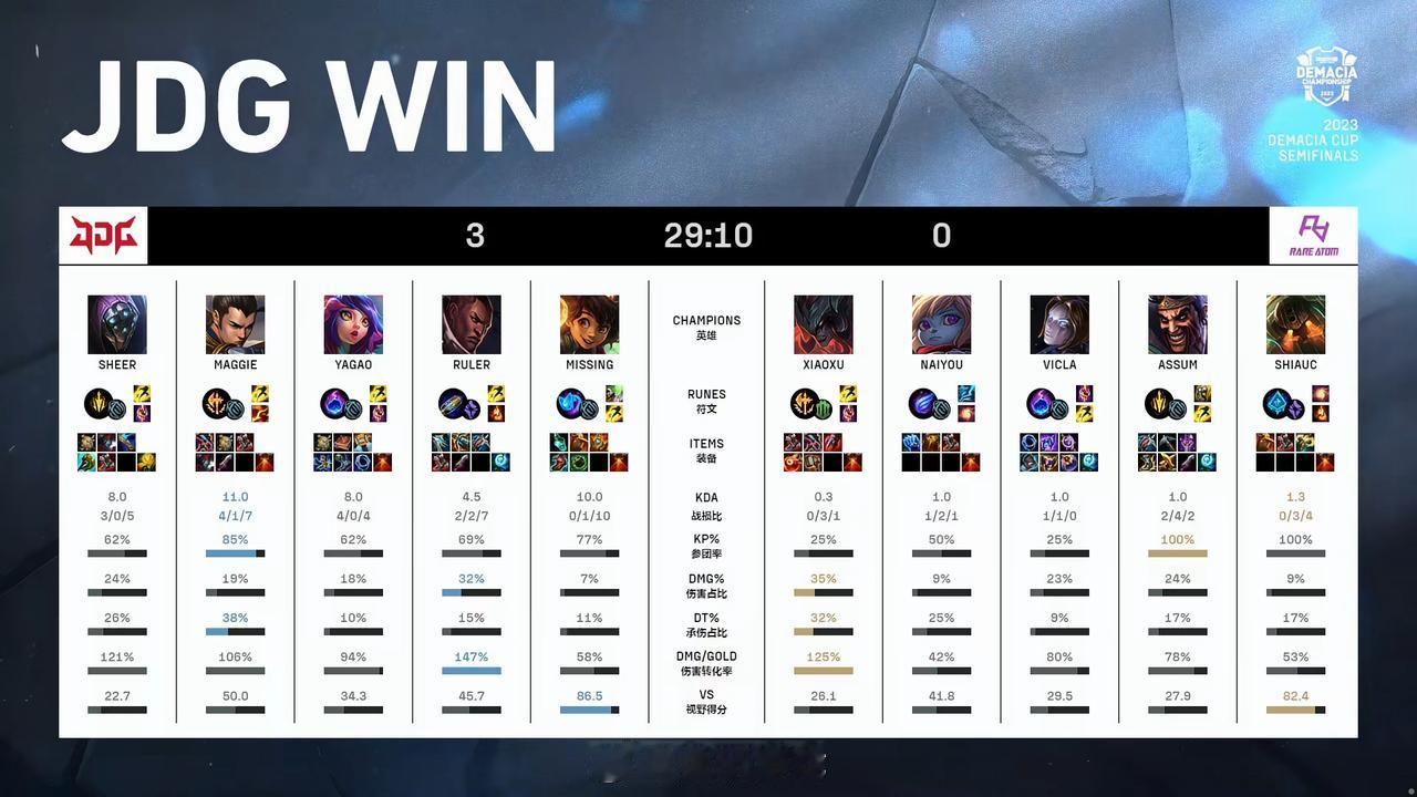 【#2023德玛西亚杯# RA 0-3 JDG】 双方赛后数据如下,你怎么评价