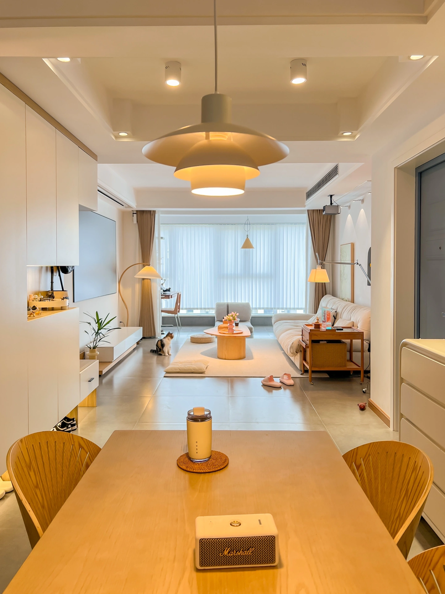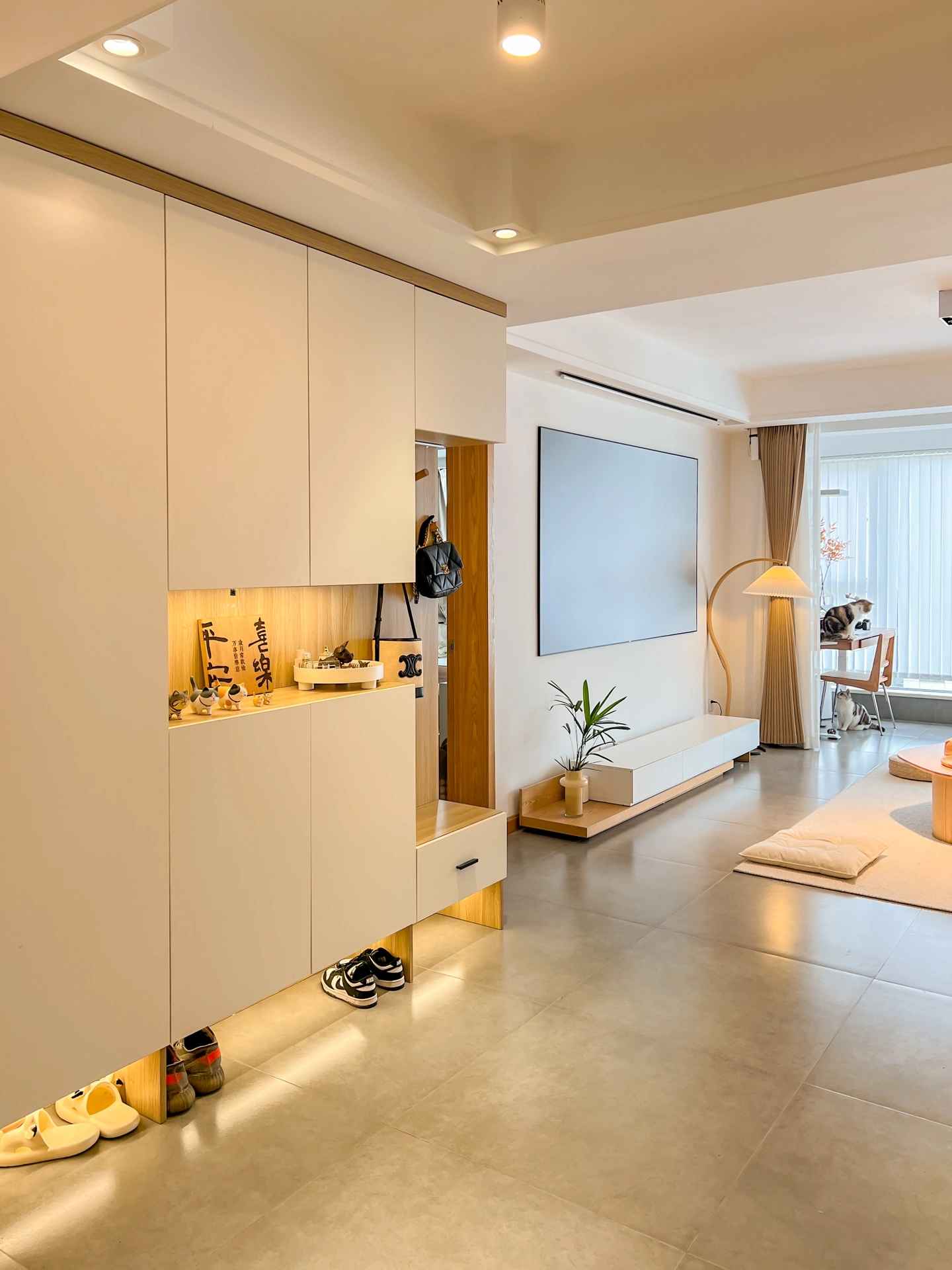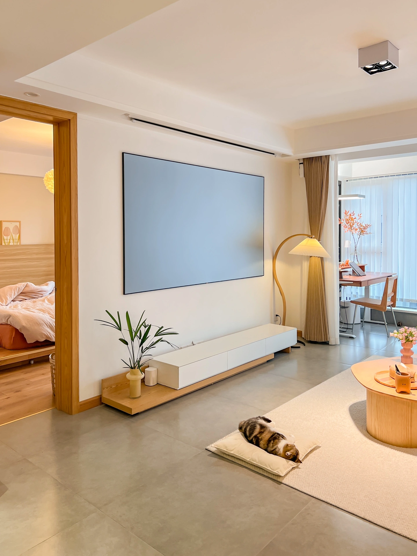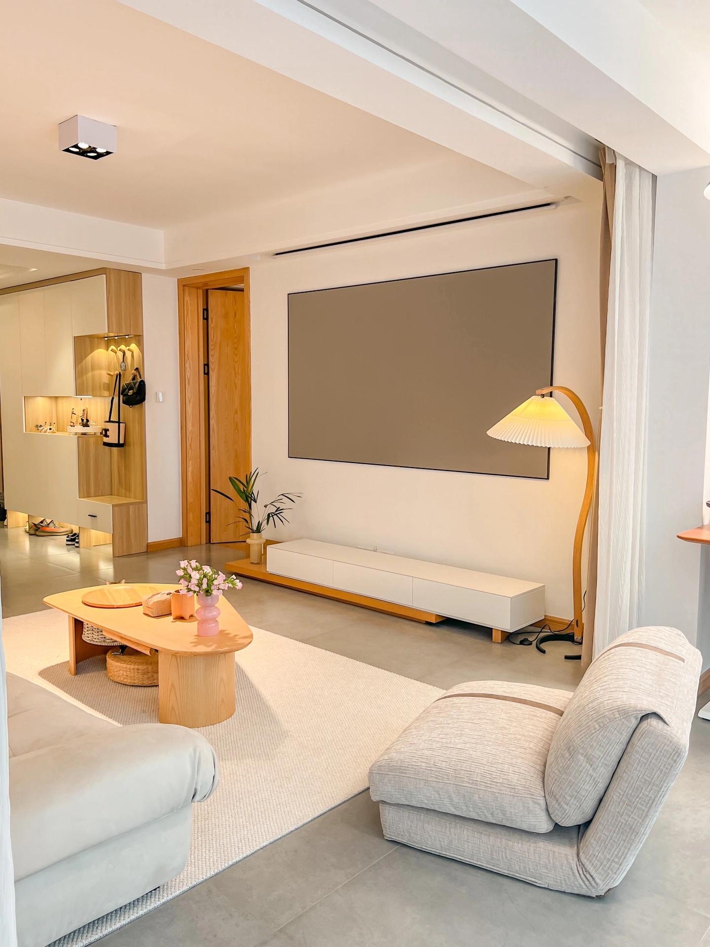 庆幸 买下这套房🏠 虽然不大,但好在喜欢~ 没请设计师,自己设计的奶油原木风 按照自己喜欢的样子,越住越温馨 . 🧾🧾🧾硬装 🌿客厅为了好打理,直接选了中性灰瓷砖通铺,省钱好打理 🌿全屋大白墙无调色,超薄边吊简单不积灰 🌿客厅无主灯设计,斗胆灯色温4000k中性光,平时不开筒灯亮度也足够哦~ 🌿柜子都是全屋定制的,原木色背板➕白色门板,无造型无拉手,主打的就是一个极简 .