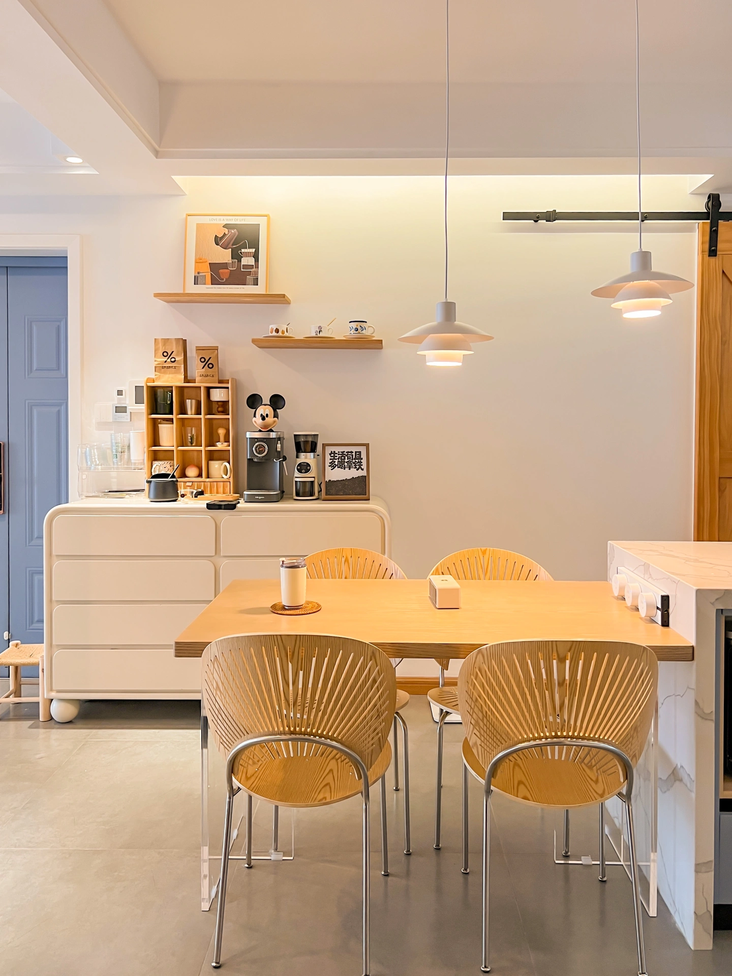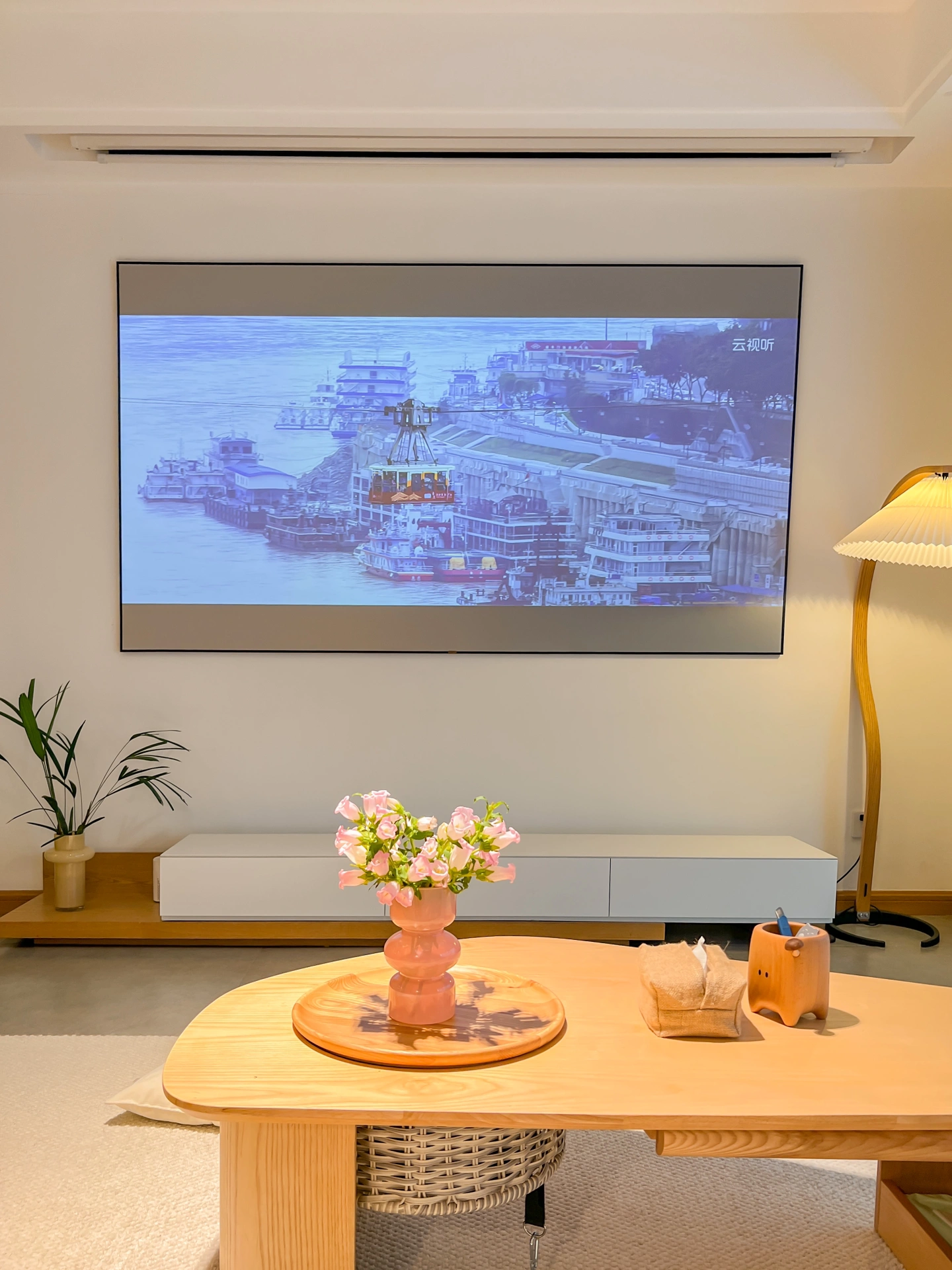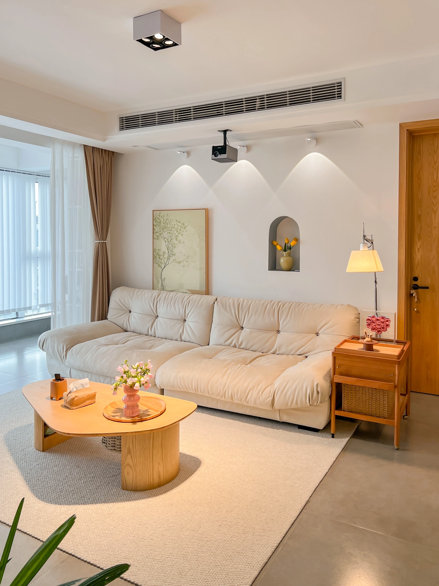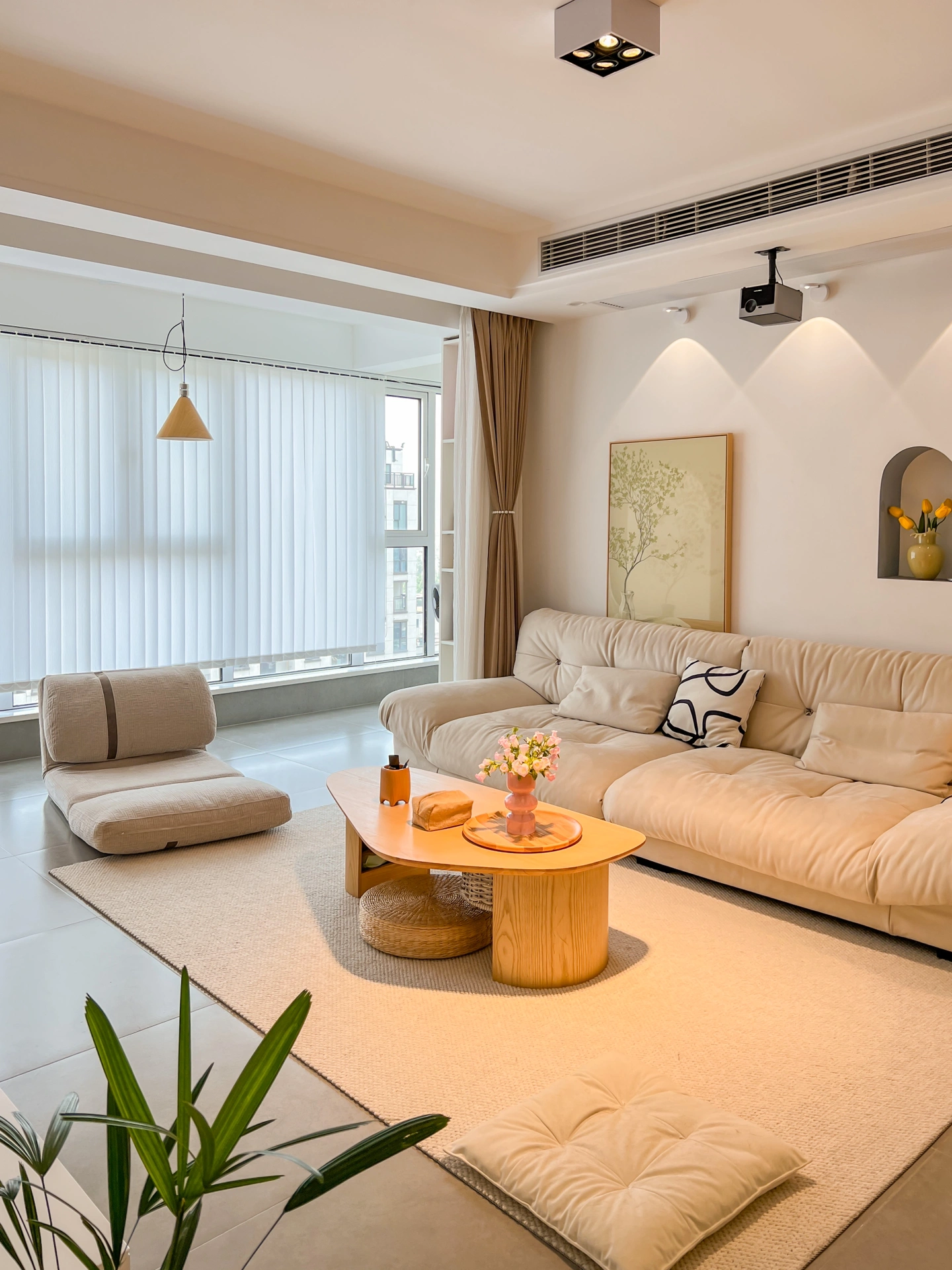 庆幸 买下这套房🏠 虽然不大,但好在喜欢~ 没请设计师,自己设计的奶油原木风 按照自己喜欢的样子,越住越温馨 . 🧾🧾🧾硬装 🌿客厅为了好打理,直接选了中性灰瓷砖通铺,省钱好打理 🌿全屋大白墙无调色,超薄边吊简单不积灰 🌿客厅无主灯设计,斗胆灯色温4000k中性光,平时不开筒灯亮度也足够哦~ 🌿柜子都是全屋定制的,原木色背板➕白色门板,无造型无拉手,主打的就是一个极简 .