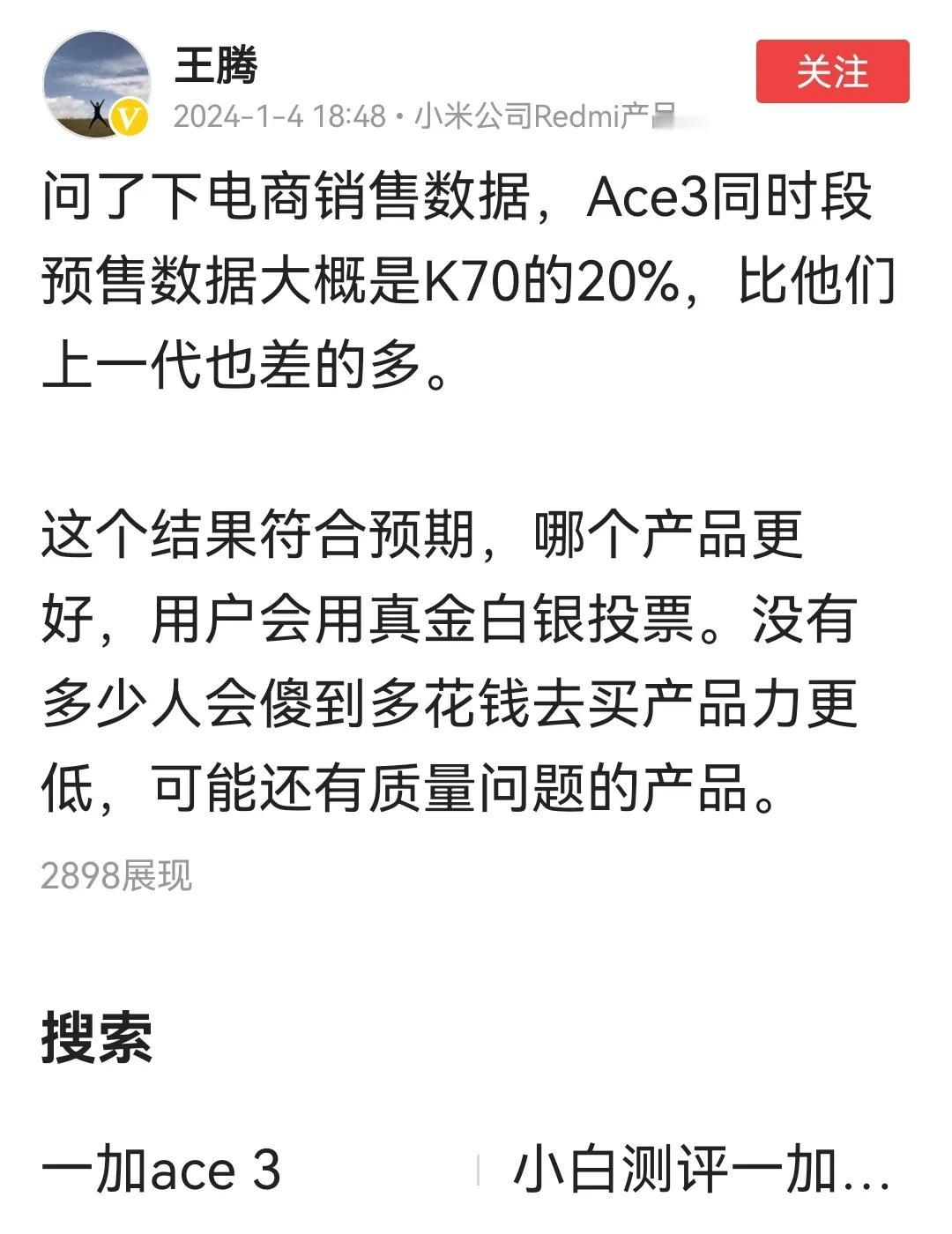 红米产品经理王腾表示“说到产品力优先,最重要的品质避而不谈,谈的只是参数”这就有意思了,之前是哪个说“没有参数,哪有体验的”和之前和友商比参数的好像是某厂吧,还有之前卢总好像也表示,“不关注友商,只是打造自己的产品”到王总这,怕是全程在看友商的发布会吧。#评论区晒图挑战赛#