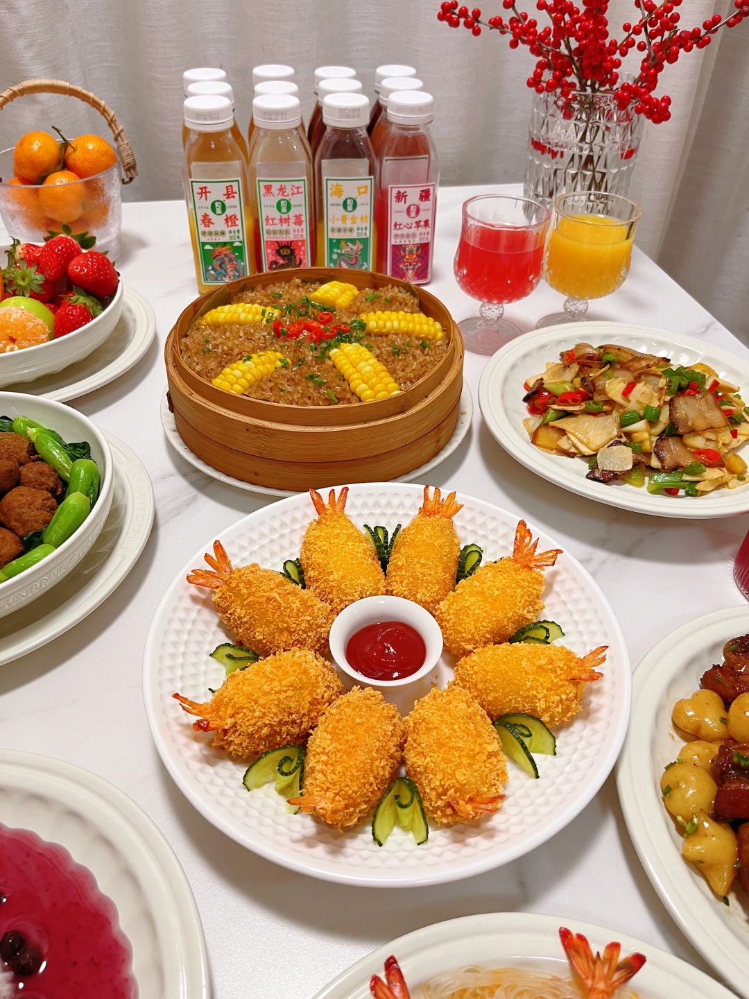 新年的脚步越来越近,一家人聚在一起,除了大吃特吃,少不了一杯好喝的饮品来收尾,解解油腻,而今年春节的大好河山礼盒,一家人聚在一起,可以每人喝到不同口味的饮品,每一瓶配料干干净净,非常适合年底聚餐,而且新春礼盒包装,不管是自己在家喝还是送礼也非常合适哦~ 🎊家宴晚餐清单(详细步骤图,图片往后翻) ✅粉丝开背虾 ✅蓝莓山药泥 ✅吉祥黄金球 ✅爱心年糕烧排骨 ✅蒸糯米鸡翅玉米 ✅红烧狮子头 ✅冬笋炒腊肉 ✅水果草莓、砂糖桔 ✅饮品如果大好河山饮品