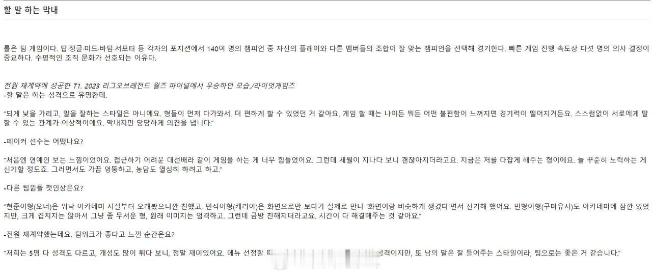 #Zeus评价Faker# 韩媒发布Zeus选手专访,文章的标题是“19岁就实现了一切?因为害怕所以更加努力训练”,部分内容如下。 Q:你以“有什么说什么”出名。 Zeus:其实我很认生,并不是健谈的风格,不过哥哥们主动靠近我,我才可以轻松地和大家相处,打游戏的时候,如果因为某些原因状态下滑,能和队友们亲密沟通当然是最好的,虽然我是忙内(队内年龄最小),可是我会振振有辞地说出自己的观点。 Q:Faker给你怎样的感受? Zeus:最开始的时候像艺人,他是我难以靠近的前辈,所以一起玩游戏会非常累,不过随着时间推移,自然而然好了起来,现在他是稳住我心态的哥哥。Faker选手一直都非常努力,甚至让我感觉很神奇的地步,偶尔又会出人意料,努力和我们开玩笑。 Q:没想到你会和T1续约。 Zeus:我第一次成为自由人,自己也觉得混乱,非常疲惫,其实我差点就离开T1了,在那种极端的处境下,我内心深处的想法愈发清晰,我想再经历一次,而且我也喜欢熟悉、舒服的环境,“不想离开”的想法占据主导,以前看到韩国队输给中国队就很心痛,所以我很想长时间效力于LCK。 Q:你对其他队友的第一印象如何? Zeus:青训时期和Oner合作了很久,非常亲密,之前只在屏幕上看过Keria哥,见到真人后,感觉和电视上长得差不多,觉得很神奇。和Gumayusi哥在青训队短暂地呆了一段时间,但我和他在青训队的时间不太重合,他是让我觉得有些可怕的哥哥,十分很严格的形象,不过我马上就和他变得亲近了,时间会解决一切问题。 Q:T1全员续约,你什么时候觉得团队配合很好呢? Zeus:我们五个人的性格都不一样,个性也很突出,真的都很有趣,点菜的时候大家也都各说各话。虽然大家都是有些厚脸皮的性格,但又很听别人话,所以作为一个团队很好。 Q:你因游戏成为精英。 Zeus:与其说是我打得好,不如说是运气好,多亏了周围的人。 #Zeus爆料差一点离开T1#