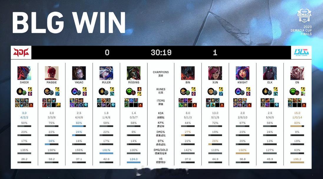【#2023德玛西亚杯# 决赛BLG 1-0 JDG】 双方本局赛后数据如下,怎么评论本局比赛? #BLG对战JDG##德玛西亚杯决赛#