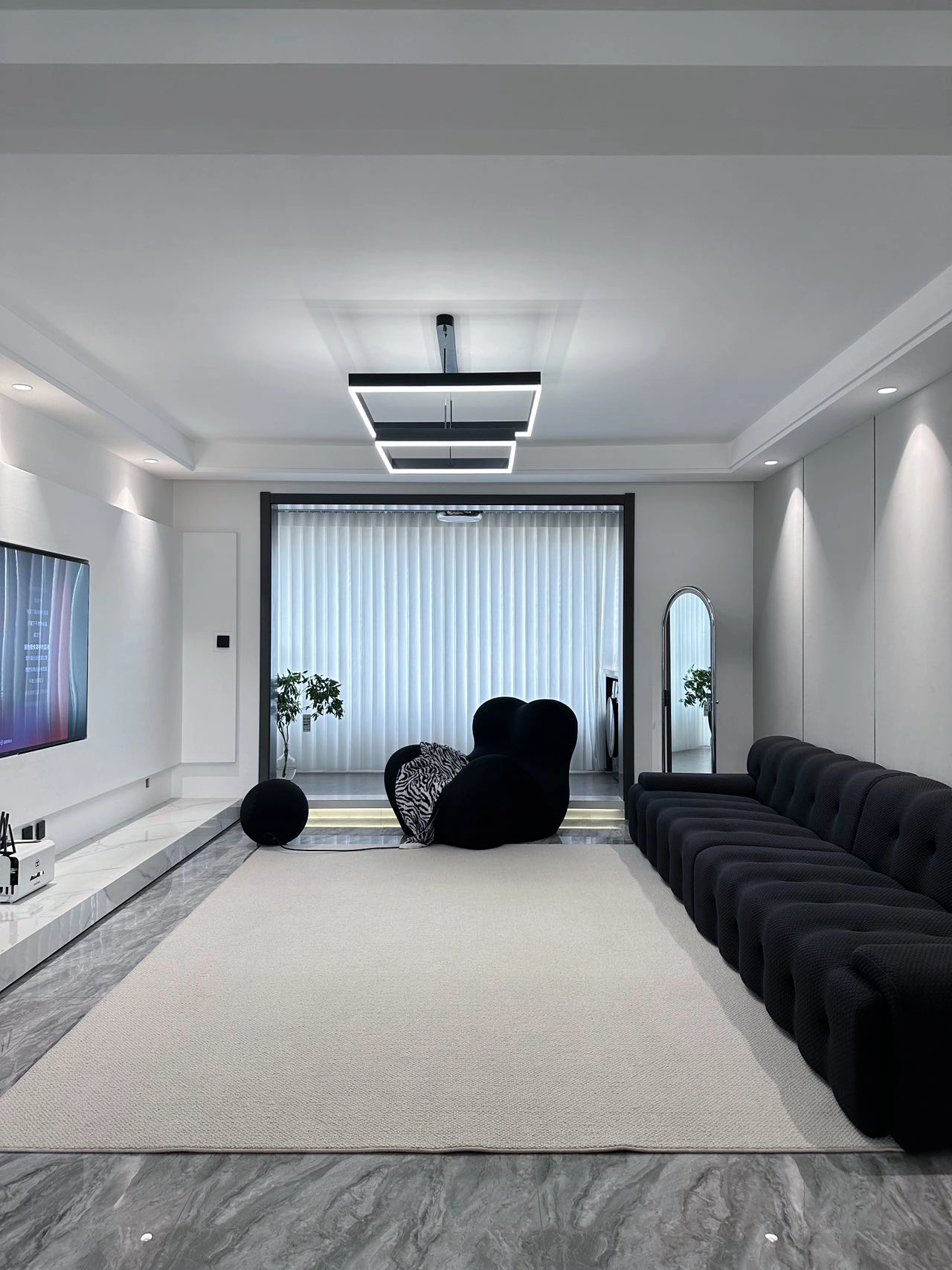 嗨,幸运又来分享dream house 了~ 我不是设计师也丝毫不懂装修和设计 只是凭借审美自装的小家! 🏠是农村拆迁分下来的安置房 建筑面积150平 套内120平 毛坯房到手就对它有了小小的规划 - 进门玄关做满天星走廊,人脸灯做玄关背景,谁来我家进门一眼难忘! 全屋地砖通铺,通透显大、 简单双眼皮吊顶,搭配三色可调的方形吊灯,简约耐看,提升高级感、 本来跟客厅通平的阳台做了垫高打造独立休闲区、 电视背景墙和沙发背景墙都是用平价的材料做出了简约高级的造型,让本来穷装的家看上去不简单! 全屋橱柜做的无把手设计,简单,干净利落! 不喜高调复杂的搭配,一张直排黑色沙发,一块素色地毯,一个懒人小座椅 就这样简简单单足矣~