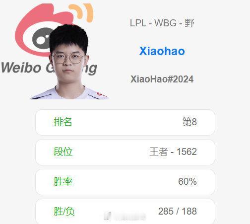 #Xiaohao韩服第八# 近期胜率达到60%,状态神勇的WBG打野Xiaohao冲至韩服第八,身处1562胜点还有上升的趋势。 回顾英雄联盟冬季转会期,Xiaohao和Weiwei都相当抢手,最终前者被WBG招入麾下,在德玛西亚杯也有亮眼表现。 大家不会忘记2023年6月5日,Xiaohao率AL战胜TT后,激动落泪,心之所向,素履以往,祝Xiaohao春季赛取得佳绩。 #Meiko韩服8连胜# #2024LPL#