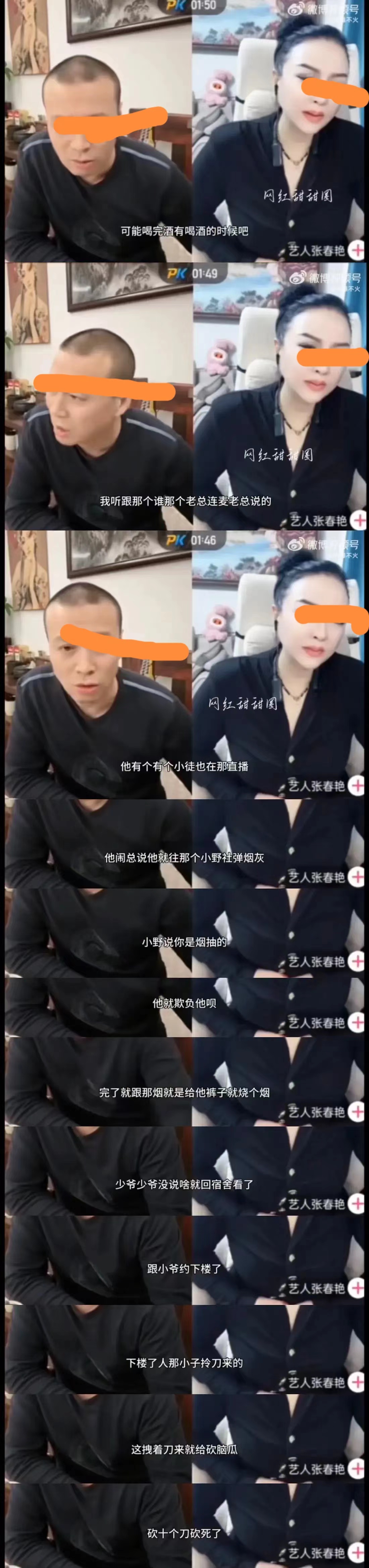 在事件出了之后,小娜娜正常在直播,而且设置了屏蔽词躲避粉丝的询问。后来开直播又专门说徒孙大拓,一直在欺负师伯刘野。这种欺师灭祖的事情为什么一直会存在呢?他们这个门派有啥规矩呢?后来大拓一直都往小野身上弹烟灰,两人开始约架下楼,徒孙大拓拎着刀,导致刘野身亡 。这怎么听起来都不像一个正经组织,好像一个黑恶势力,谁随身揣着砍人的刀呢?#是否该管管网红#