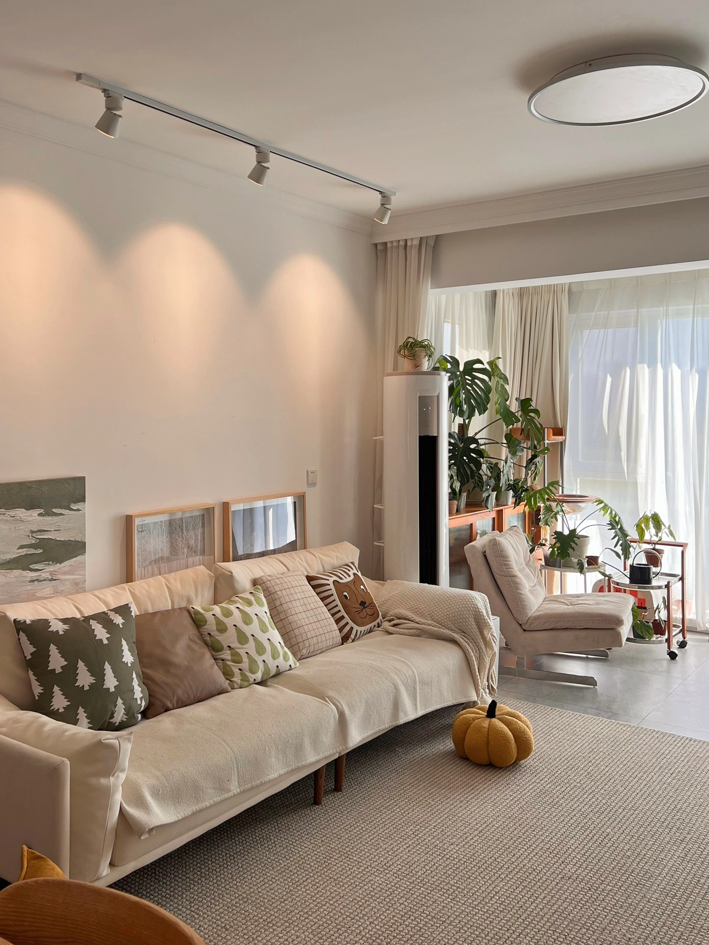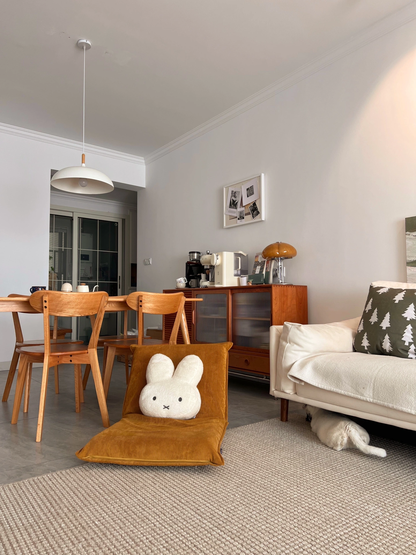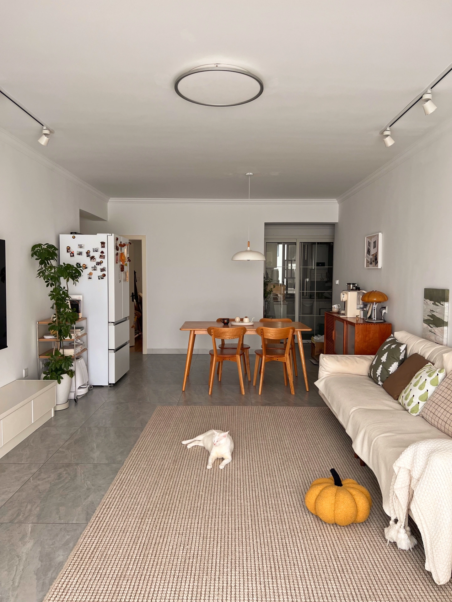 关于我家: 套内100平,三室一厅 浅灰色的柔光砖+原木风的家具 让我家和传统的原木风格有了一些差距 感觉作为普通人来说 想要拥有一个好看的家 最便捷的方式 就是简单的硬装+舒适的软装 再用上一些绿植做点缀 我家就是白色作为装修的基础色调 再用部分的原木色+绿植 装饰出来一个舒适温馨的小家🏠 打通了原本的阳台隔断 既增加了收纳,又扩大了客厅空间