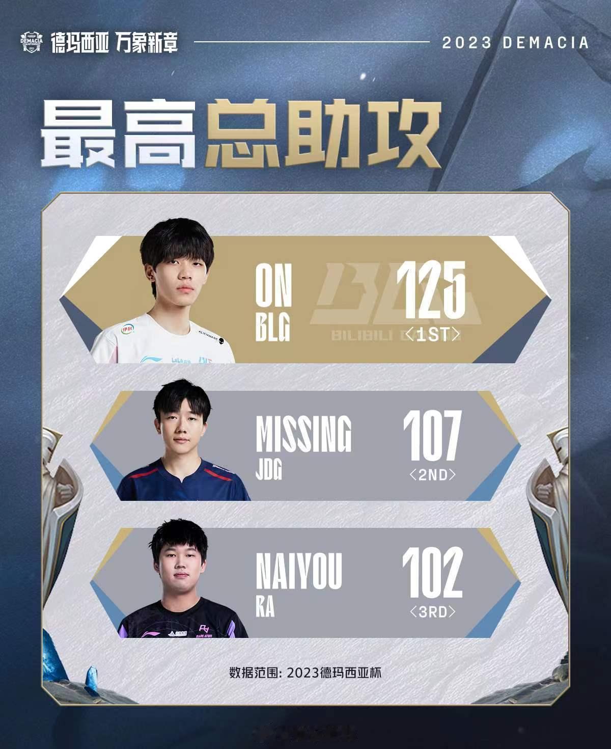 【2023德玛西亚杯最数据】 最高总助攻:@BLGON 总助攻前三:@BLGON @JDG_Missing @naiyoupup #2023德玛西亚杯#