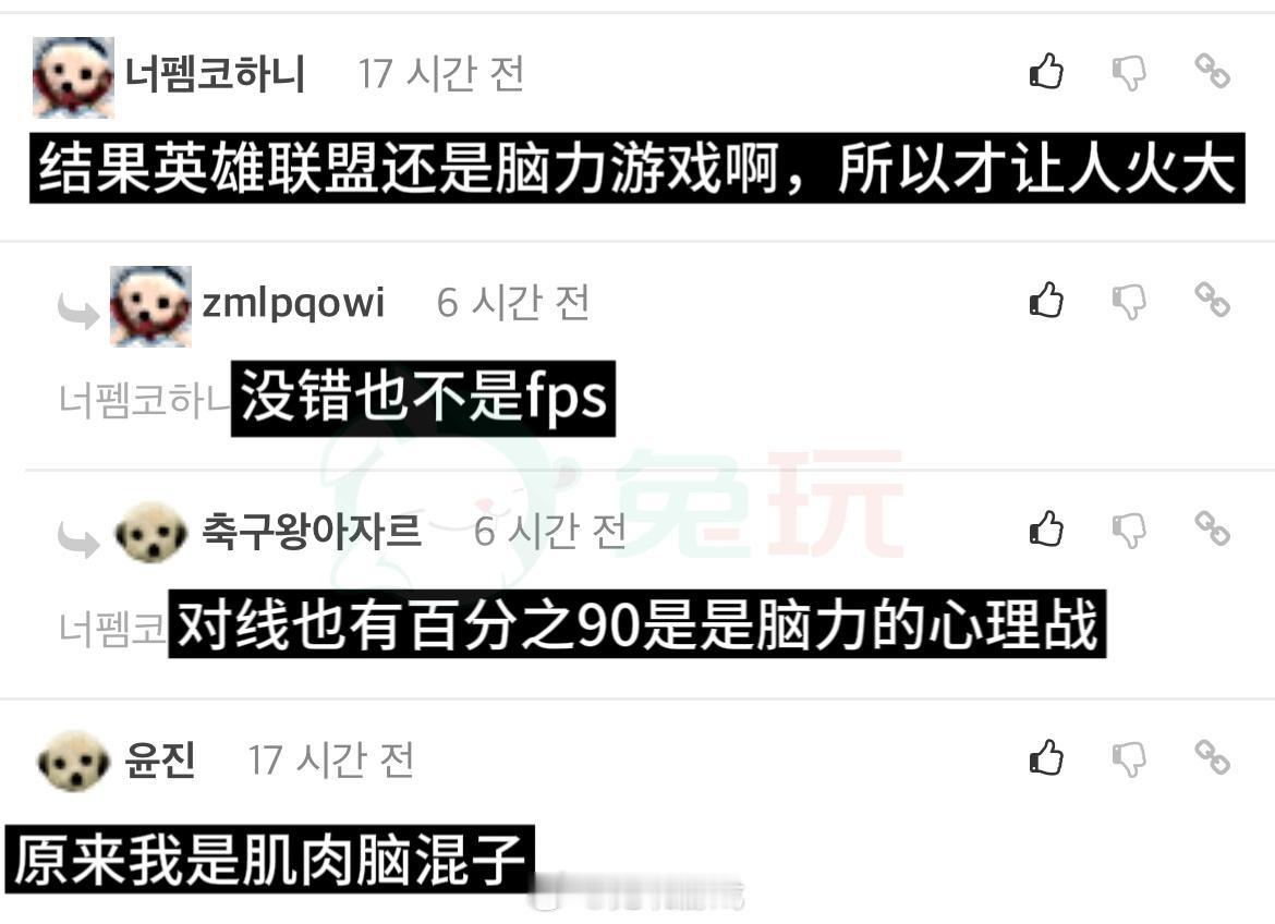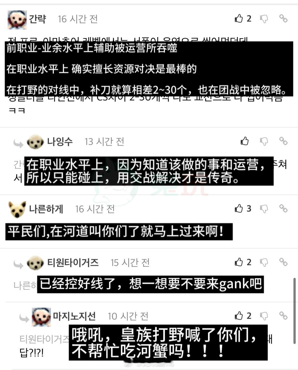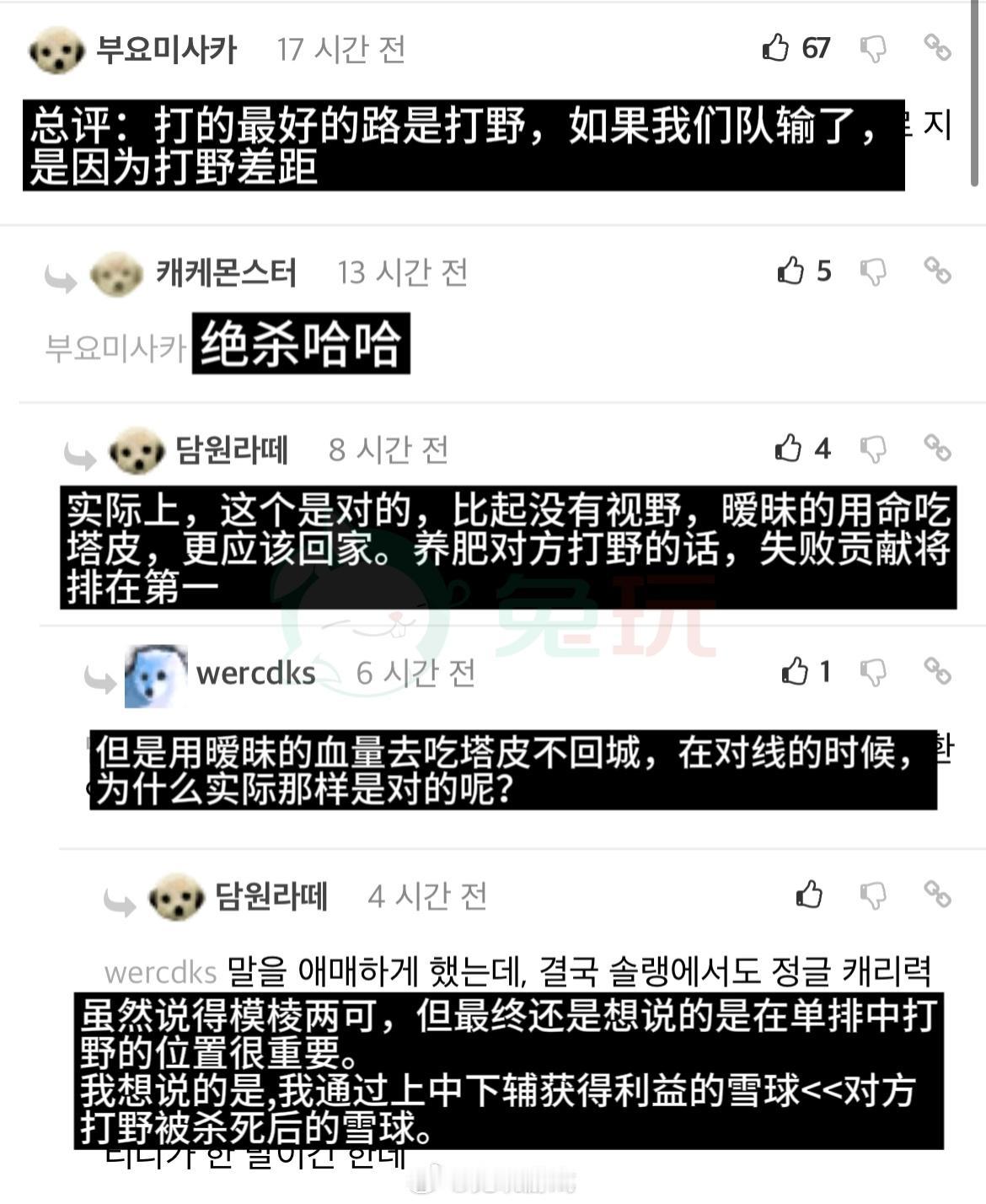 【兔玩翻译】韩网热议:实时树维基(韩国百科)对今天的(各路)ck的每一条分路的一句话评价 上单:操作实力很强但是被熟练的打野们捉弄的肌肉脑混子 打野:就算是很艰难的情况,也拼了命活下去赢了的屠夫 中单:孤高且强大,但是不知道哪里松弦了的皇族 AD:虽然拥有优秀的反应能力,但只要别人不给饭吃,就什么也做不了的手指王子 辅助:虽然被需要但是如果不是和队友一起显得无力 #英雄联盟#