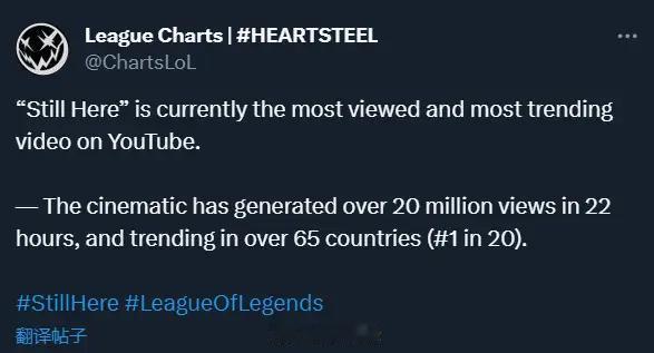 据外媒统计,2024赛季CG《不渝》首日在YouTube平台的播放量来到2200万,这一数字也刷新了KDA的《MORE》在2020年创下的LOL相关视频首日1200万播放量的首日播放量记录。 截至目前LOL相关视频在YouTube平台的首日播放排名前7的视频如下: 1、2024赛季CG《不渝》——首日播放量约2200万 2、KDA官方MV《MORE》(2020年)——首日播放量约1200万 3、2020赛季CG《战士》——首日播放量约1060万 4、2023全球总决赛主题曲MV《登神》——首日播放量约740万 5、KDA官方MV《THE BADDEST》(2020年)——首日播放量约740万 6、2022赛季CG《呼唤》——首日播放量约600万 7、心之钢MV《妄想》(2023年)——首日播放量约540万 值得一提的是,目前2024赛季CG《不渝》在超过65个国家登上YouTube频道热门视频排行榜,并在其中20国登顶 #英雄联盟#