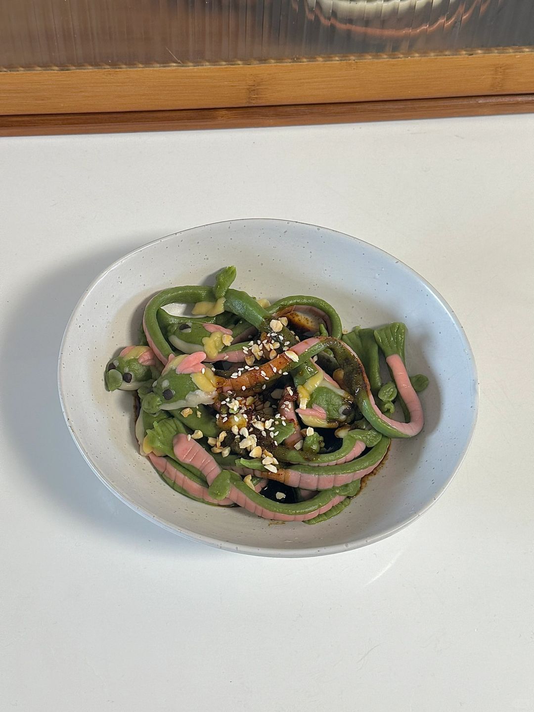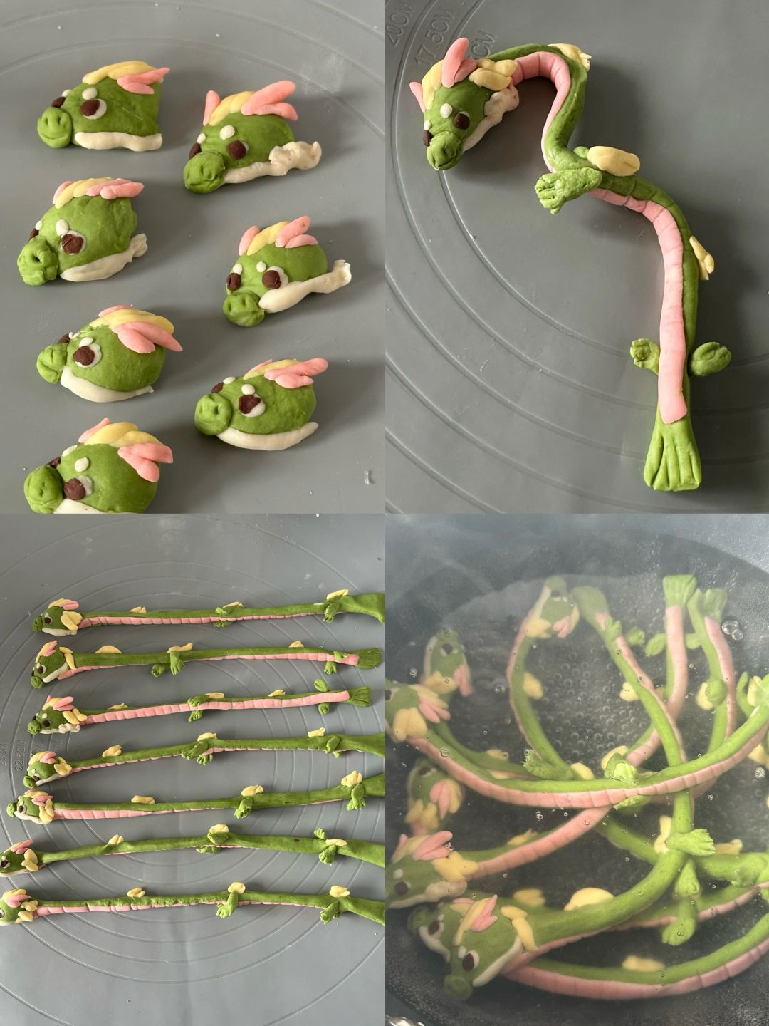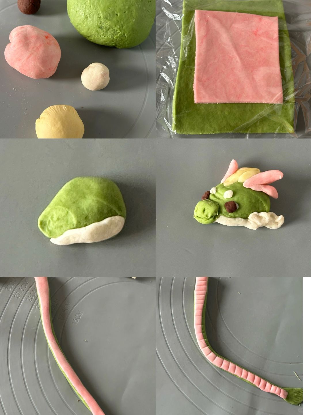 1.面团配料混合均匀分份调色,绿色和粉色擀扁,盖上保鲜膜松弛30分钟以上