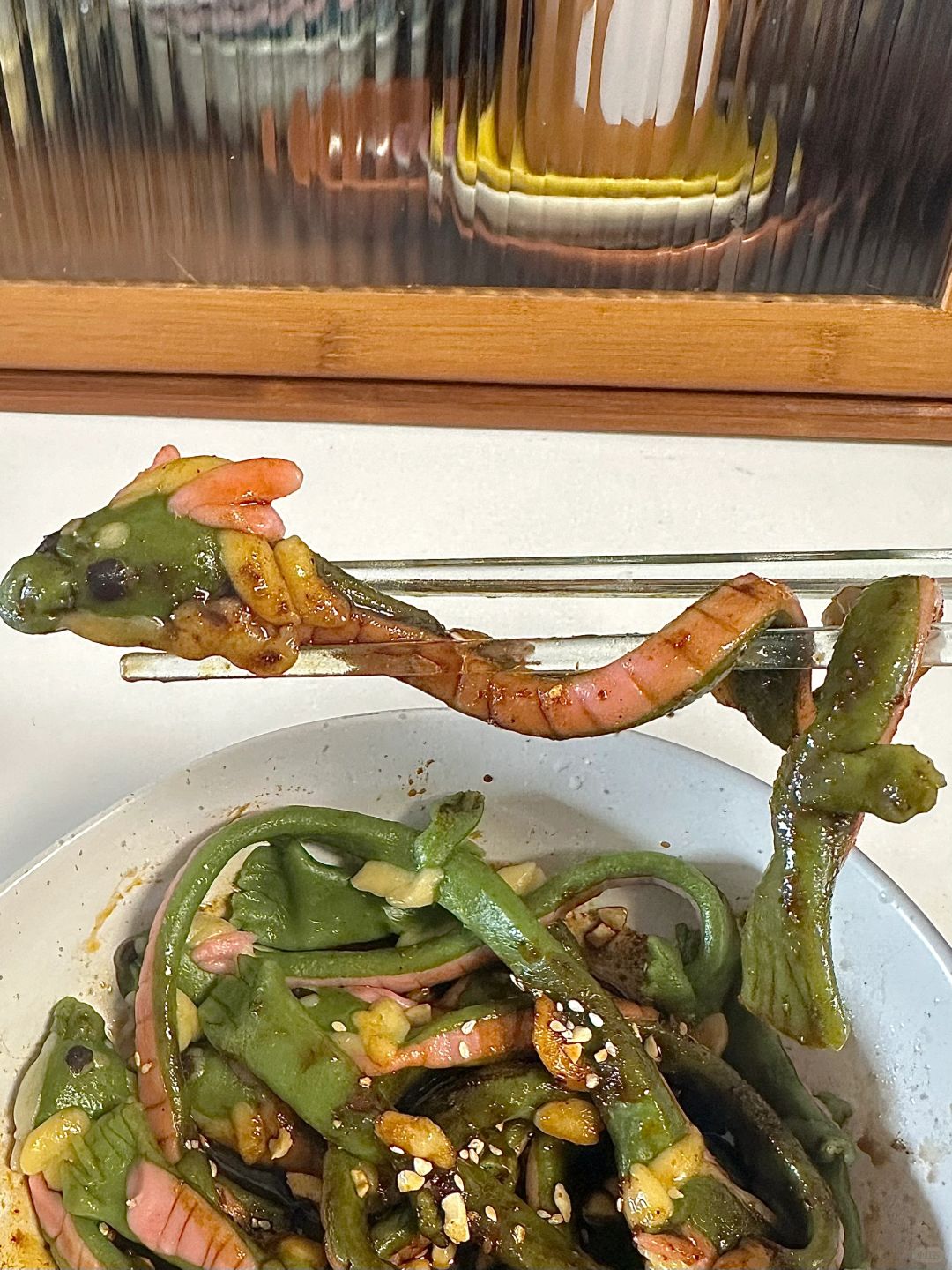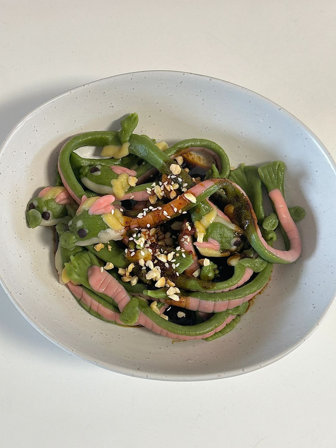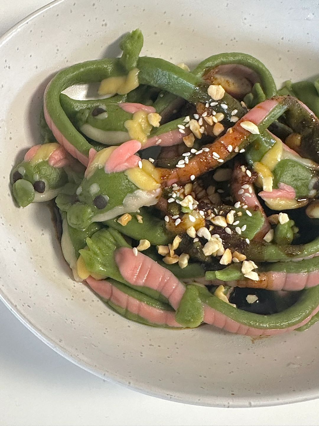 1.面团配料混合均匀分份调色,绿色和粉色擀扁,盖上保鲜膜松弛30分钟以上