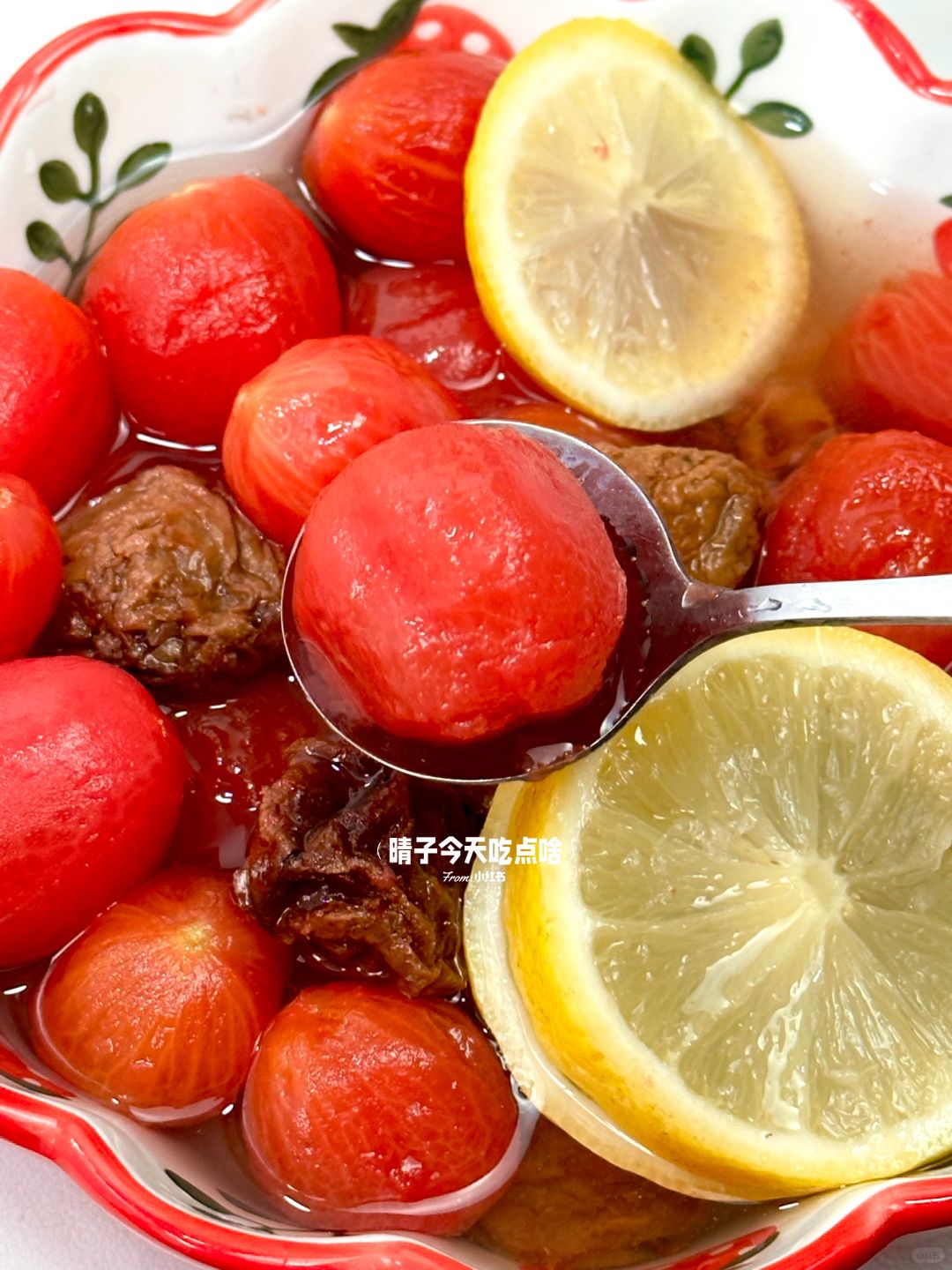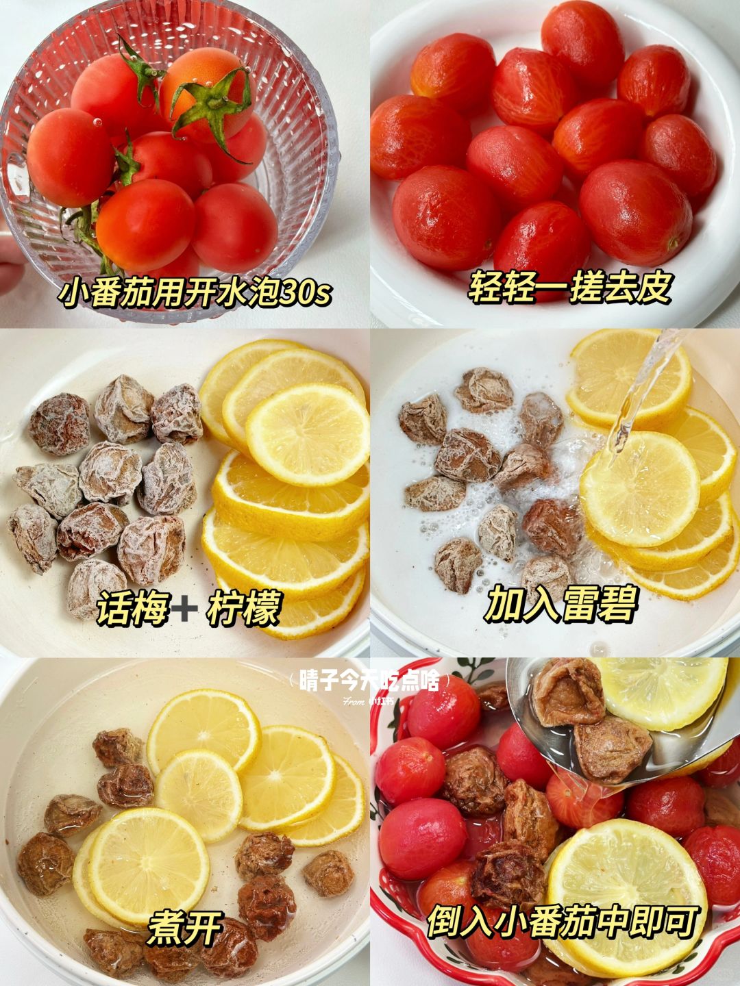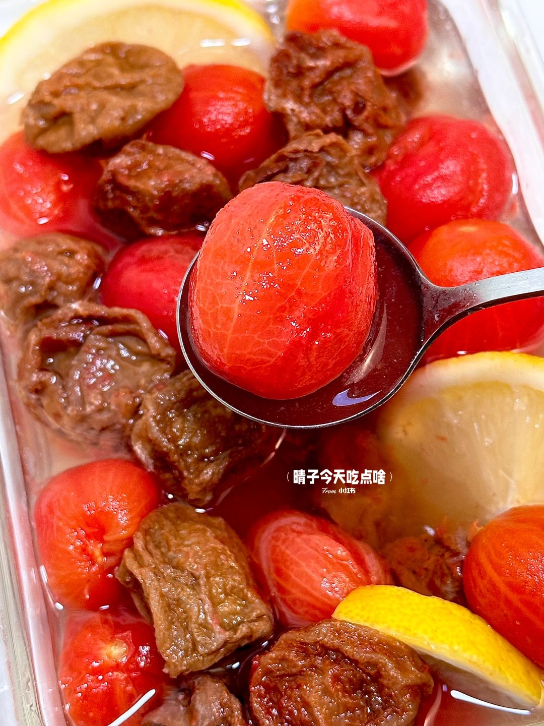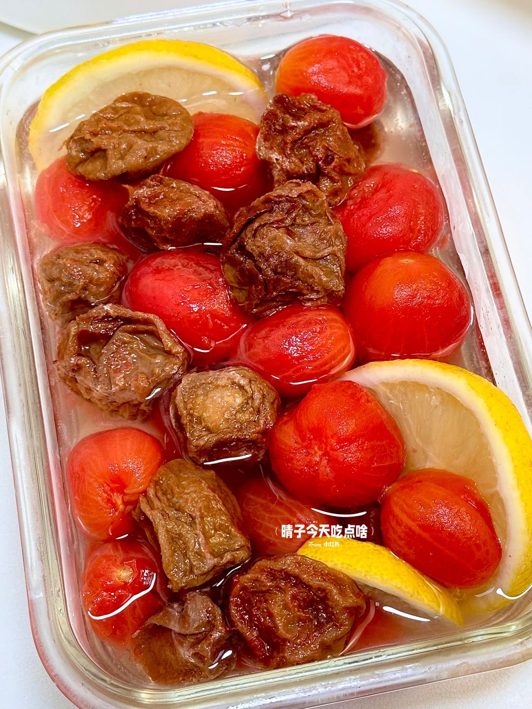 梅渍小番茄!!!!真的绝绝子!😆😆😆 一口下去,酸酸甜甜的!💕超解腻!清爽感巨足 晶莹剔透吸满汤汁!话梅香气!😋酸酸甜甜的 ! 真的爱s了!好吃飞了! - ❤️准备小番茄15颗、话梅4颗、柠檬🍋、雷碧 ❤️做法: [一R]小番茄开水泡1分钟后,可以轻松去皮 [二R]把柠檬和话梅倒入锅里用雷碧煮开就好 [三R]全部食材倒入保鲜盒内冷藏2小时就OK啦! . 😆大鱼大肉吃多了咬一口巨清爽解腻~ 还会一口爆汁💥我的年度坠爱!梅渍小番茄!!! 汤汁都想喝光光!!一定要去试试!!