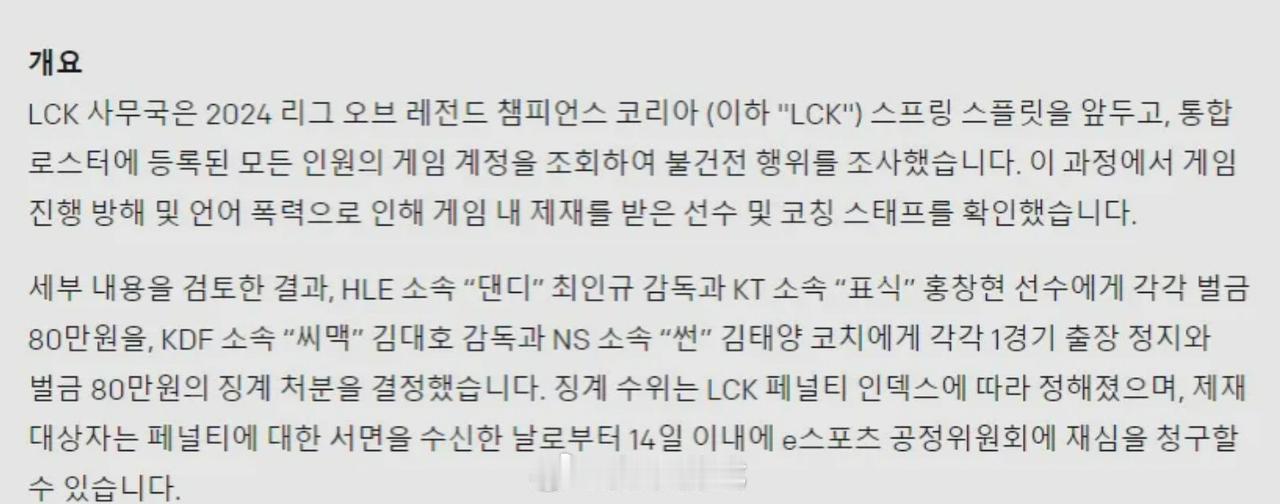 #LCK处罚公告# LCK发布处罚公告,对HLE.DanDy监督、KT.Pyosik选手各罚款80万韩元,对KDF.cvMax监督和NS.SSUN教练(二队)禁赛一场并且罚款80万韩元。 公告内容:2024LCK春季赛开赛前,LCK事务局对进入大名单的所有人游戏账号进行了调查:是否存在不当行为。 过程中确认了妨碍游戏进行及语言暴力而受到游戏内处罚的选手和教练组。我们决定对HLE.DanDy监督、KT.Pyosik选手各罚款80万韩元,对KDF.cvMax监督和NS.SSUN教练(二队)禁赛一场并且罚款80万韩元。 根据LCK规则手册,我们决定了最终的处罚程度,惩戒对象可以在收到书面处罚材料之日起14日内向电子竞技公平委员会申请再审。 #Pyosik被罚款# #cvMax监督禁赛#