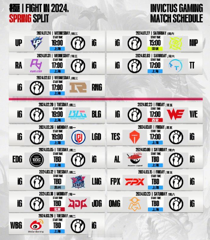 #2024LPL春季赛# iG官宣英雄联盟分部2024LPL春季赛名单,Loong担任主教练,上单选手Wen上调至一队。 上单:邹树德 YSKM 廖文威 Wen 打野:郭棋凡 Tianzhen 中单:袁成伟 Cryin ADC:安善业 Ahn 骆世豪 xiaoyueji 辅助:张锐 Wink iG春季赛赛程如图二。 #2024LPL#
