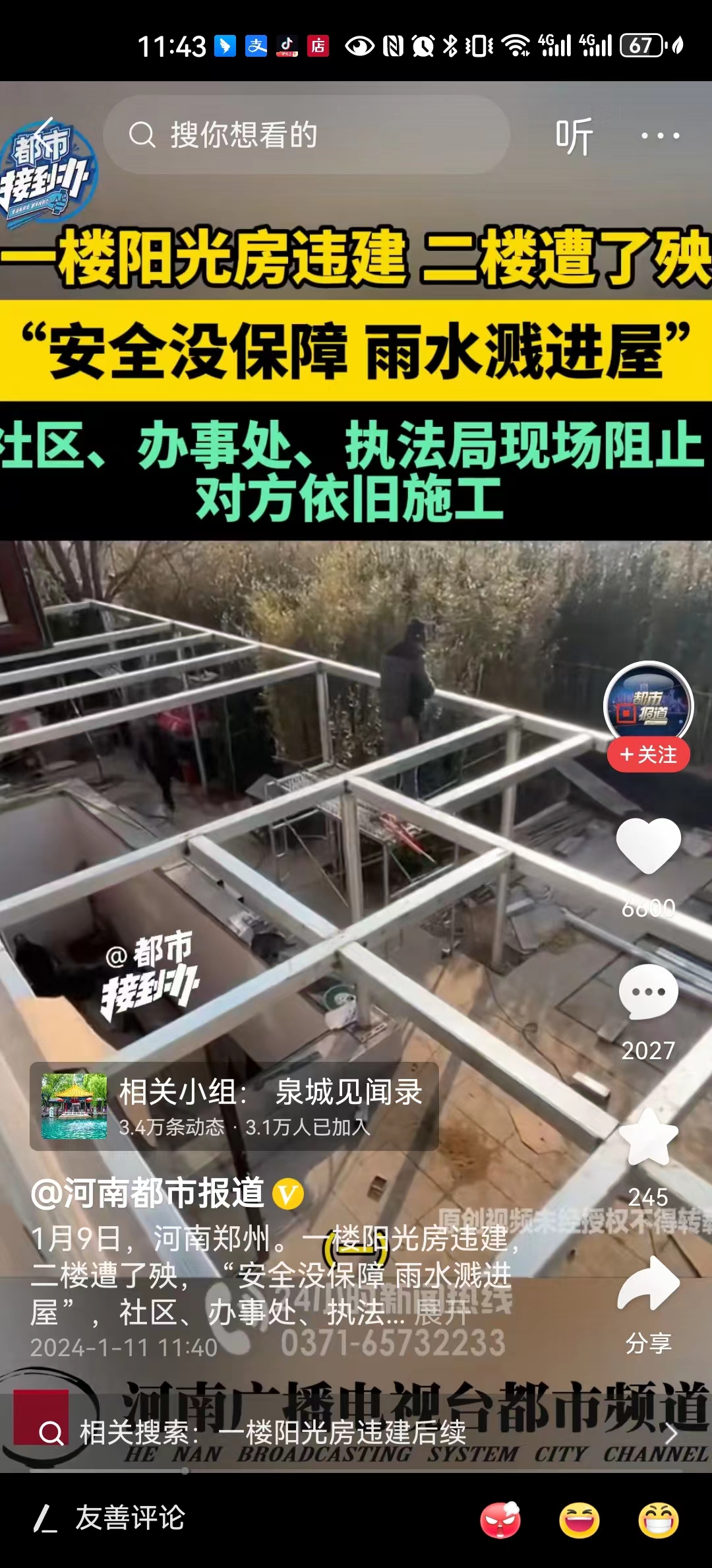 #一楼违建阳光房 多部门阻止未果#城管局这个时候办事又畏畏缩缩的,现场工作人员还说我们可以认定他违法,但是我们没有执法权,执法权在执法中队。但是请问执法中队不也是城管局的下属机构吗?这还是一个单位之内的两个不同职能部门,都不能及时联动,在这里城管部门和街道部门真的值得去反思检讨一下。