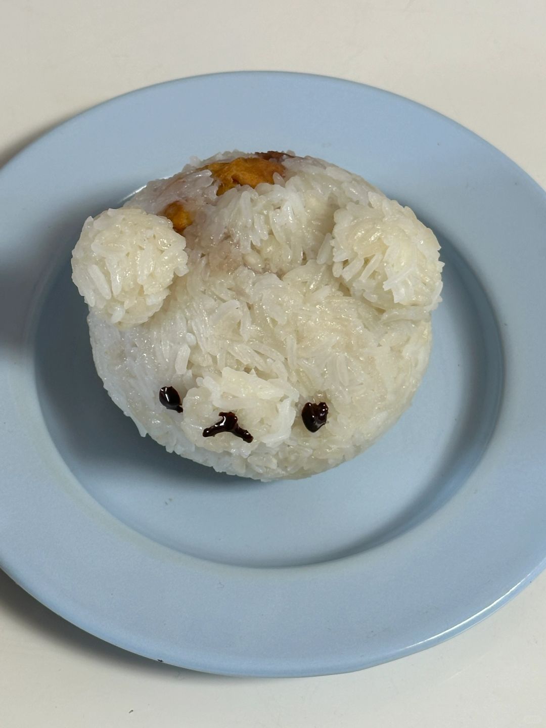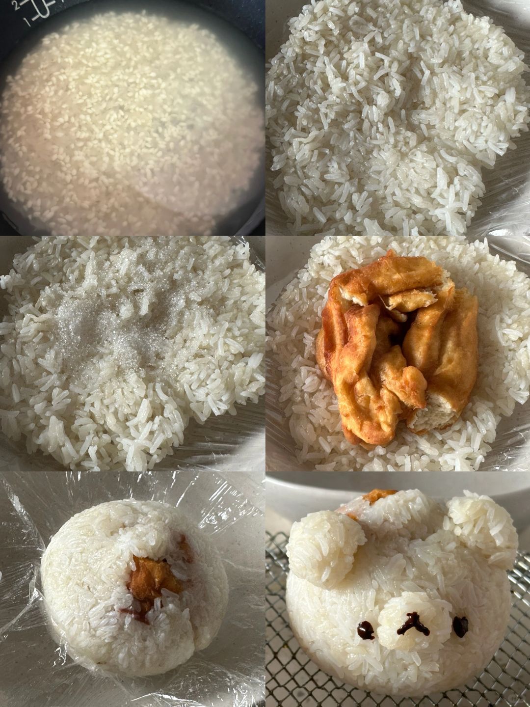 3.盘子盖上保鲜膜压上饭,撒上白糖放入油条,捏紧,再装饰上耳朵用巧克力画上表情