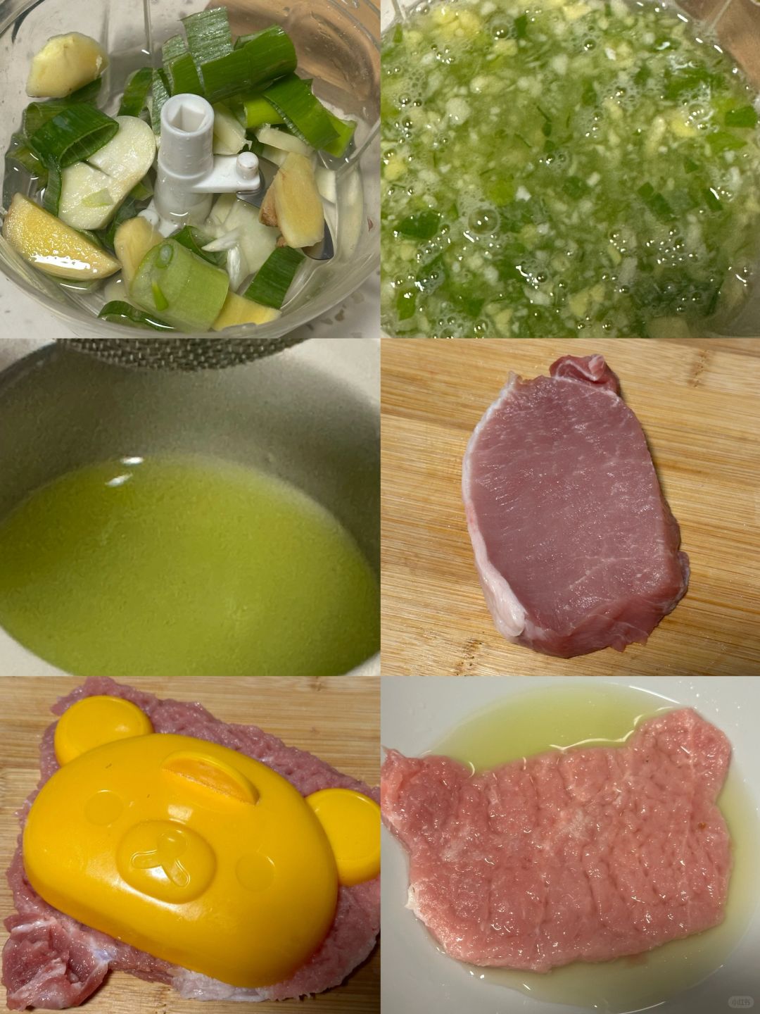 2.猪扒用肉锤或刀背打扁,剪出熊头,在盘里加入葱姜蒜水腌制一会
