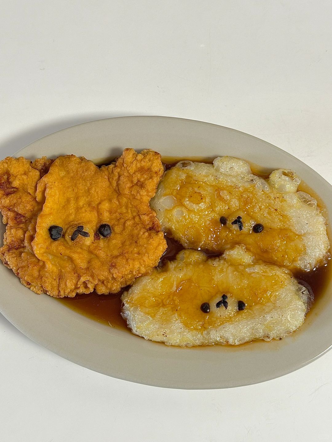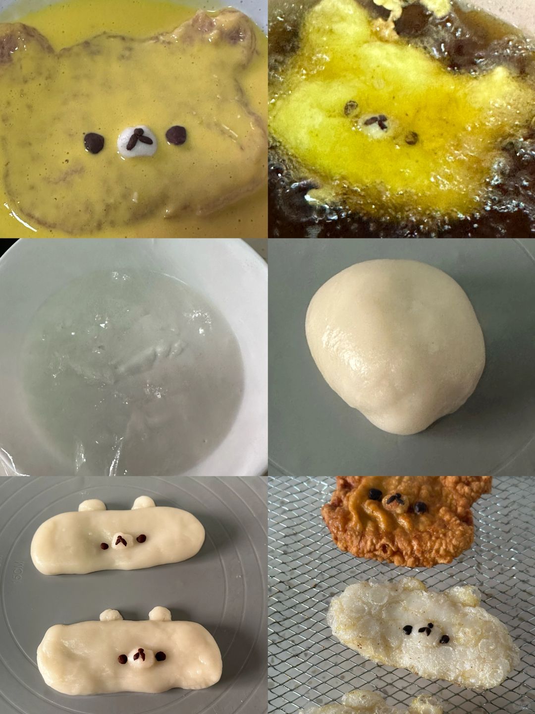 3.年糕配料混合后放入可以进微波炉的碗中盖上保鲜膜微波炉打2分钟,取出在抹油面垫上揉光滑,分两份拉成椭圆形,装饰上细节,冷油下锅炸至膨胀后立刻捞出