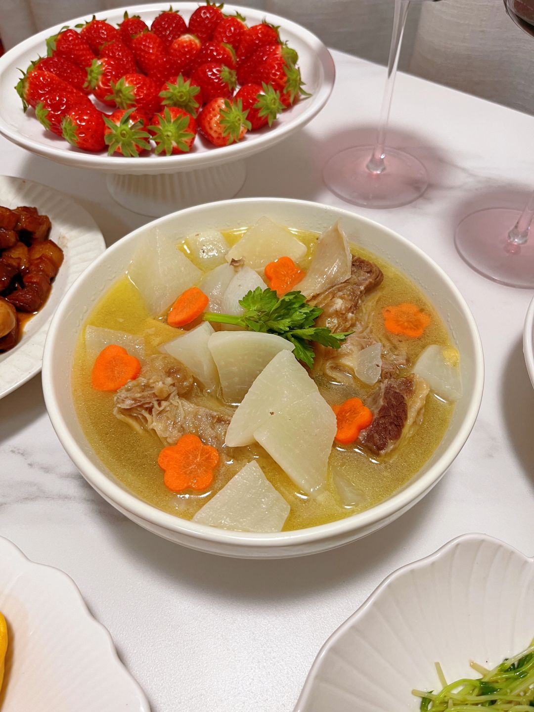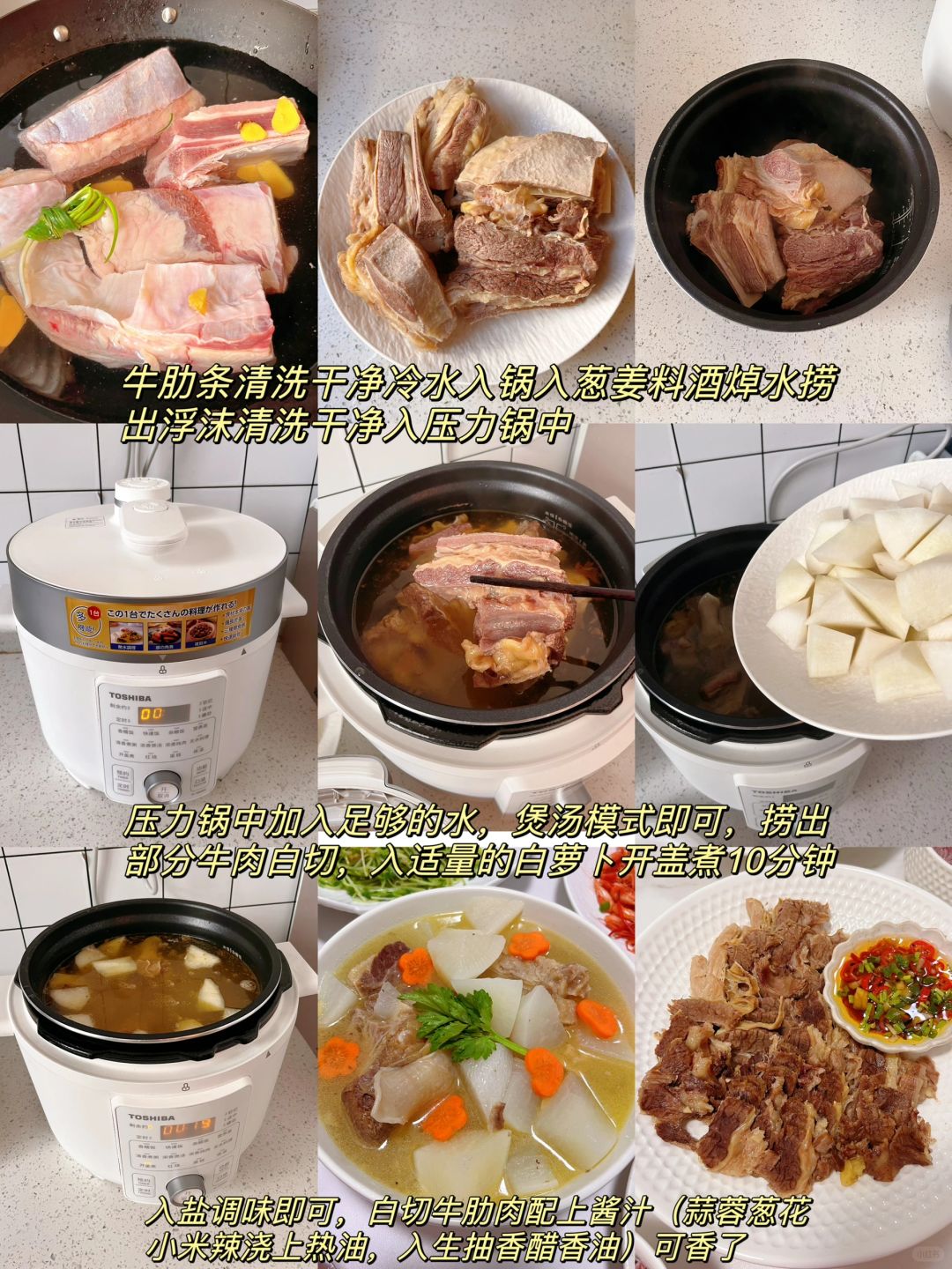 🏮年年亦如此,我亦盼年年,新的一年,一定要自己动手做一顿丰盛的仪式感晚餐,这人间烟火气象征着新年的蒸蒸日上,和家一起享受制作美味佳肴,享受团圆的时刻~ 🧧家宴晚餐清单(详细步骤图,图片往后翻) 1⃣️牛肋条萝卜汤 2⃣️白切牛肋条 3⃣️无水䓤油鸡 4⃣️无水焖小河虾 5⃣️元宝馒头 6⃣️鹌鹑红烧肉 7⃣️蒜蓉豌豆苗 8⃣️芹菜炒猪耳 🌱每到过年,每家做的菜特别多,家里的灶眼根本忙不过来,我家基本会把菜分配到其它锅中同时烹饪,掌握好时间,出锅时吃到都是热乎乎的,电压力锅实用性就很高,今天的菜我用东芝电压力锅轻松搞定几个硬菜,炖出来的肉非常软烂~