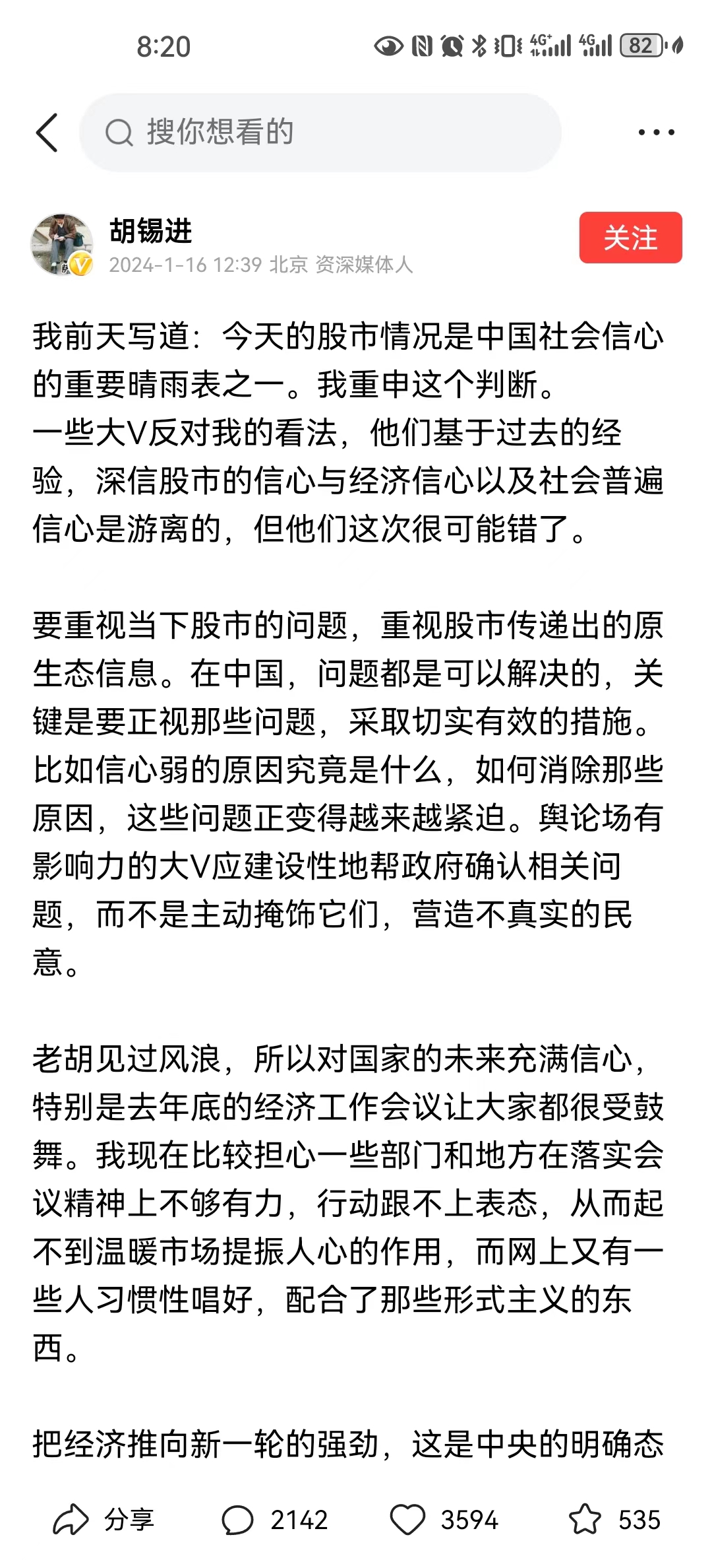 #胡锡进:股市是社会信心重要晴雨表# 这可能是2亿多股民,第1次真正喜欢老胡。看来老胡真正的入厂,花真金白银买了股票,才能慢慢理解A股投资者的苦啊。当老胡深陷亏损之后,他才会站在普通的散户投资者一边发声呐喊,因为这样不但是救了自己,也救了与他同命相连的股民们。