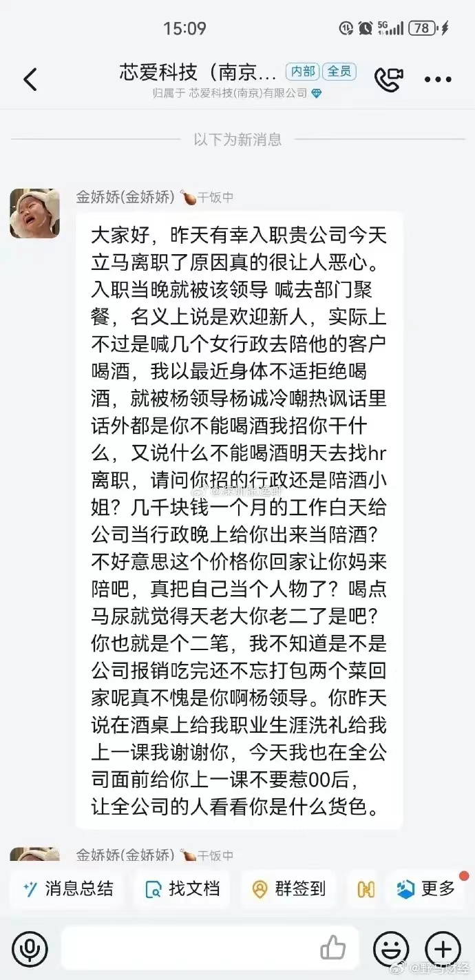 #曝00后痛骂领导入职当晚让陪酒#如果是真的,那这个所谓的领导真的很下头!那种恶臭的职场文化,早应该被整治了!现在00后年轻人来整治也不晚,到公司上班,做的是事情,凭什么下班之后还要去参加所谓领导指定的饭局?为什么还要陪陌生人喝酒呢?为什么在下班之后还要被领导pua呢!