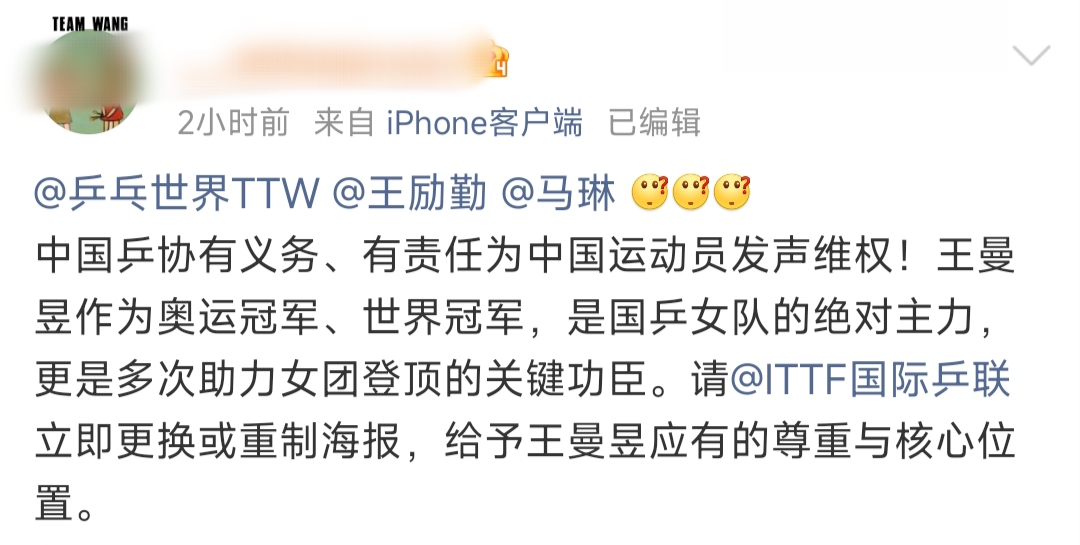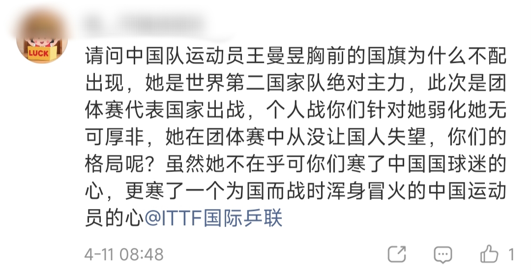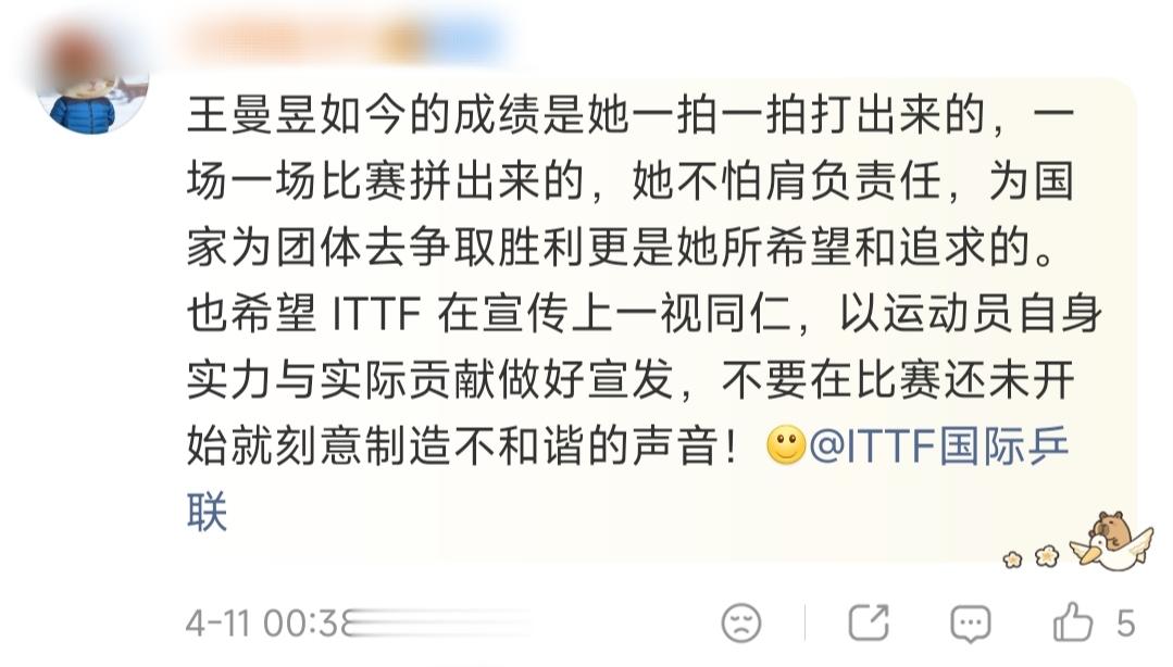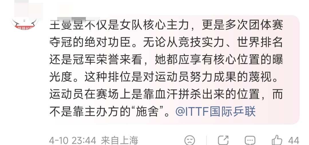 球迷看到王曼昱被ITTF国际乒联如此差别对待,甚至有意弱化存在感,顿感寒心。