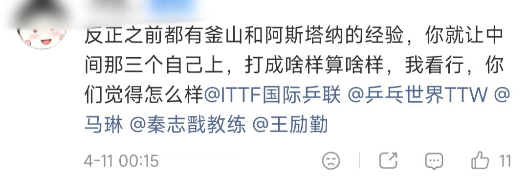 球迷呼吁王励勤带领的中国乒协以及以秦志戬为首的国乒教练组可以为保护国乒绝对主力王曼昱做出努力。不要一味无视ITTF国际乒联和WTT世界乒联这些国际组织对王曼昱的不公平对待,国家英雄奥运冠军一次次被如此对待,这太让国人寒心了!
