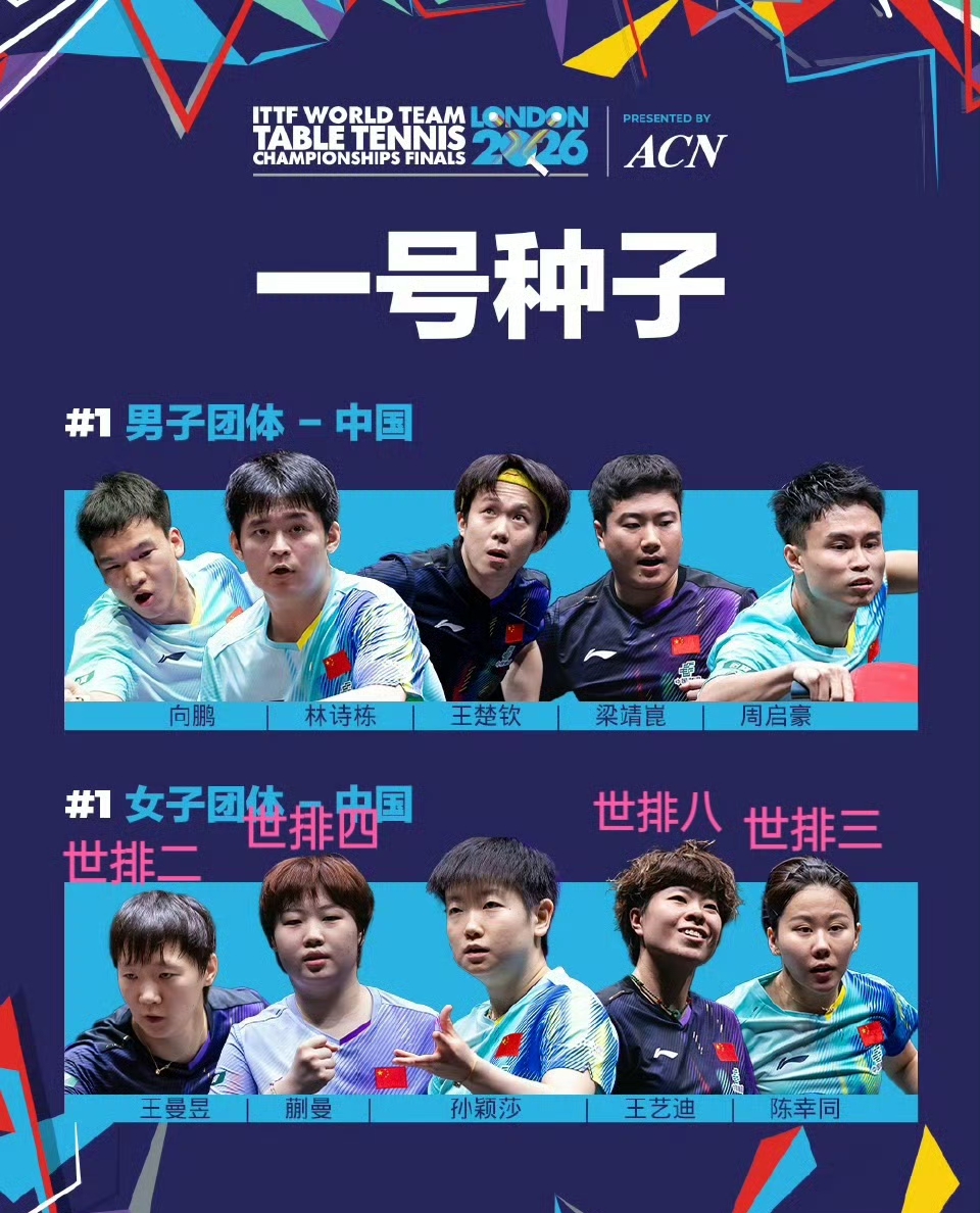 国乒男女队作为此次伦敦团体世乒赛一号种子,男队由王楚钦、林诗栋、周启豪、向鹏、梁靖崑五人代表参赛。女队由孙颖莎、王曼昱、陈幸同、蒯曼、王艺迪五人代表参赛。(运动员姓名按选拔公布时间排序)