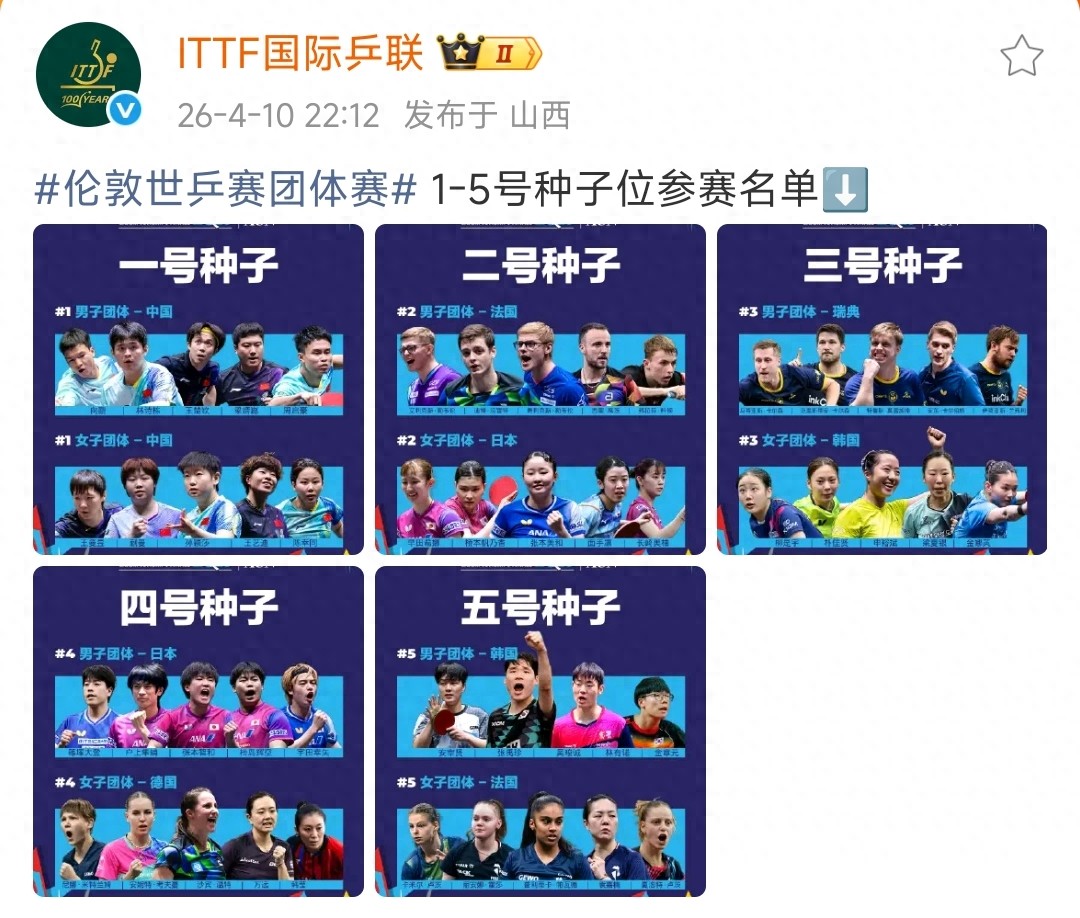 ITTF国际乒联昨晚公布伦敦世乒赛团体赛1-5号种子参赛名单。