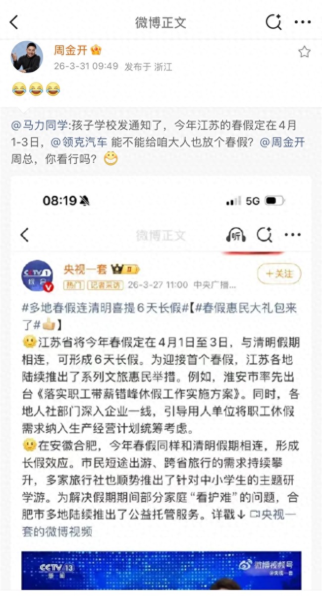 “别人家的公司”这个梗,在职场人的圈子里已经流行了很多年。每次看到别人家的公司发福利、搞团建、放长假,评论区里都是一片“慕了慕了”的声音。而这一次,“别人家的公司”轮到了领克汽车。就在最近,领克做出了一件让无数打工人羡慕的事——给所有一线员工放一天带薪春假——无需抵扣年假、不调休、也不影响正常薪资发放。消息传出后,朋友圈瞬间炸了锅,无数人感叹:同样是上班,为什么差距这么大?这一天的春假,看似简单,但它的含金量却不容小觑。首先,它是带薪的,不是那种“放假但不发工资”的“假放假”;其次,它是纯粹的,不需要调休,不需要补班;最后,它是有温度的,选择在春假期间放假,让员工可以陪孩子踏青、陪家人赏花。