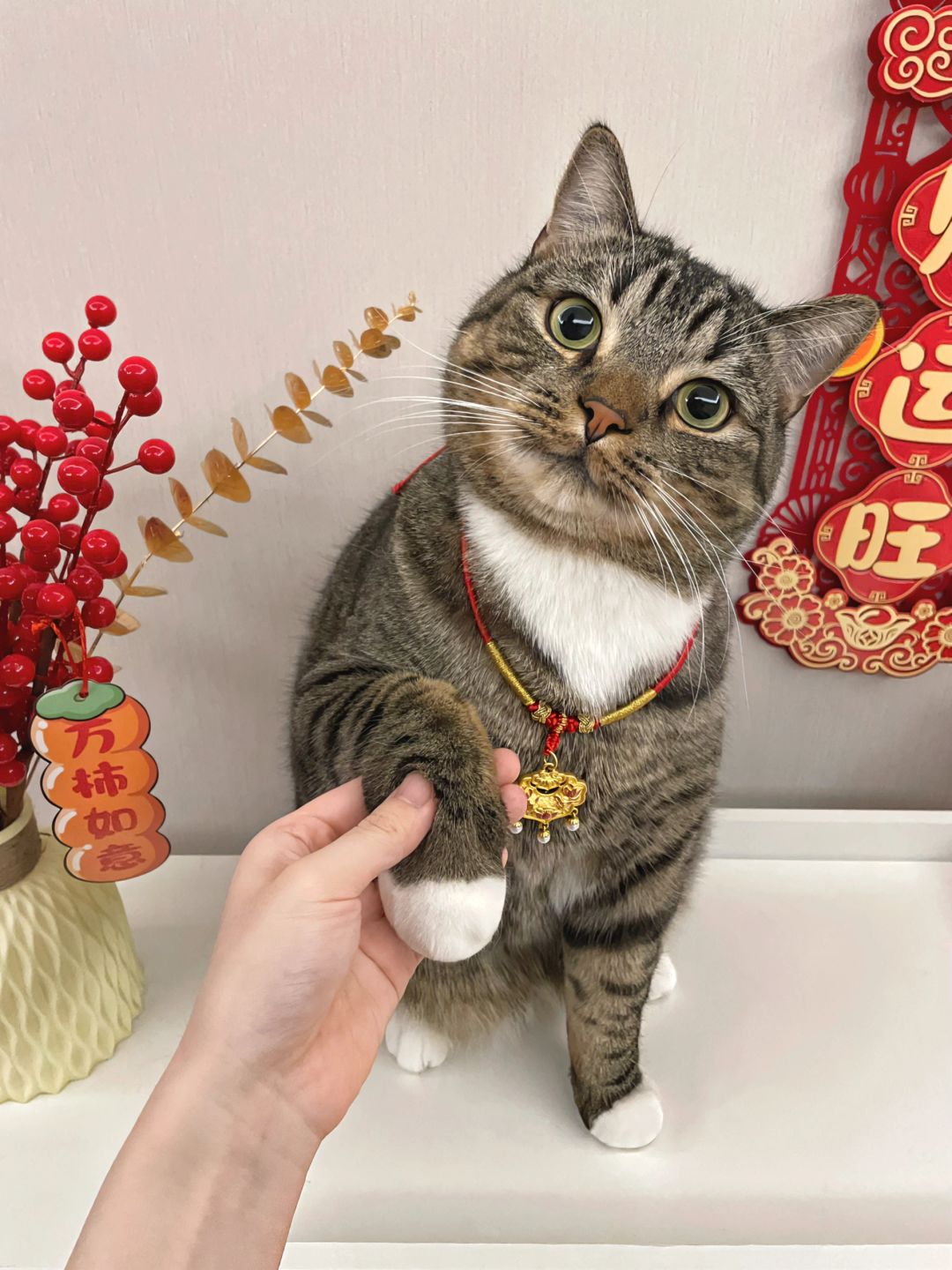 “憨态可掬,爪爪白净,脖子上还戴个小黄金”![老虎R]这看起来有没有像个招财猫呀🐱?~