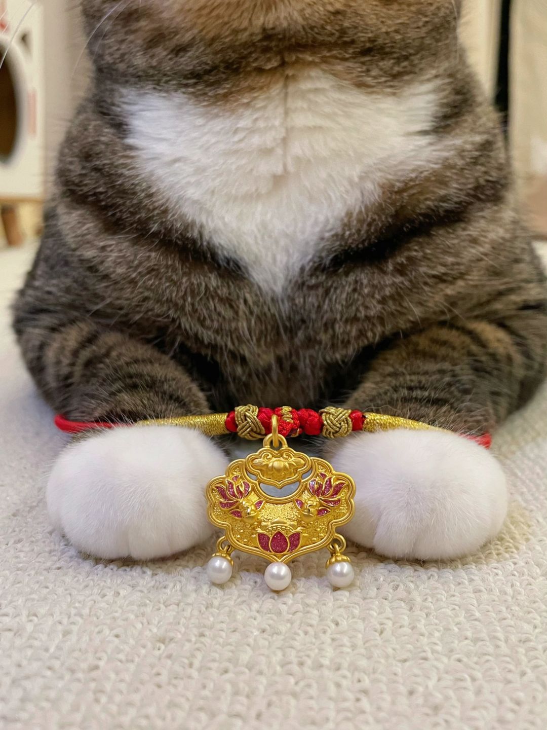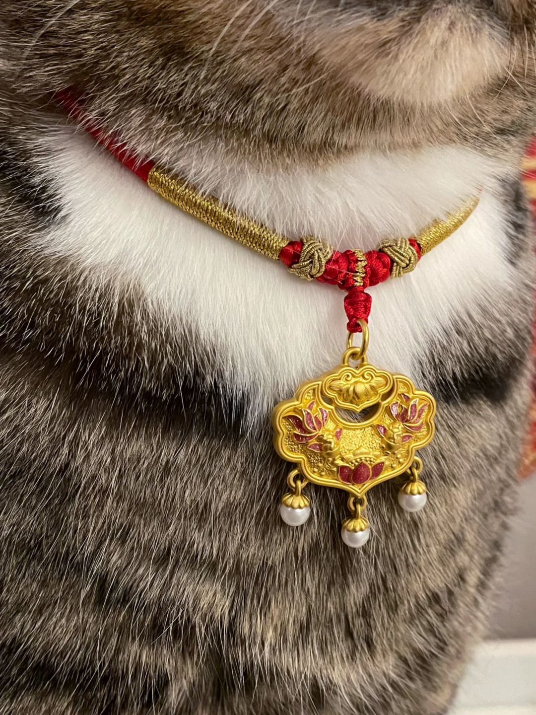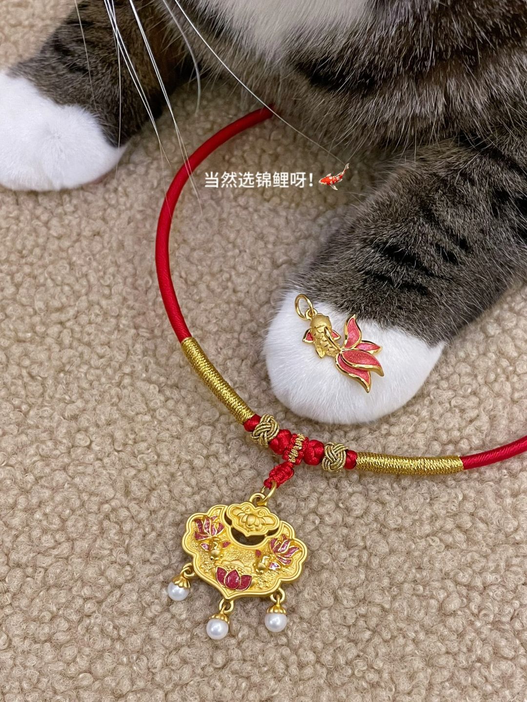 都说人靠衣装马靠鞍,新年我寻思给饼饼也捯饬一下~年终去买礼物的时候,就给饼饼也买了周大福SOINLOVE的朱砂红锦鲤平安锁和锦鲤吊坠,沾沾喜气!