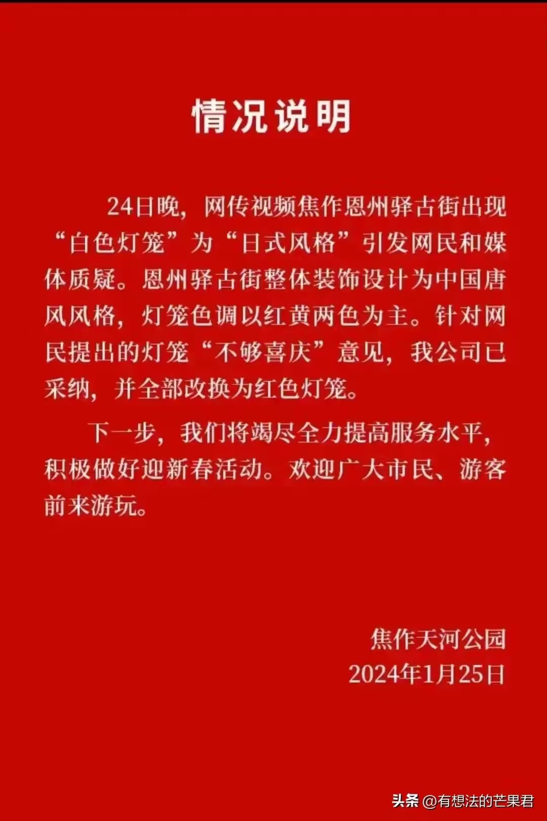 网友拍出来的照片,其实看上去确实是那种日式的白灯笼。而且还学着日本的文化元素,在灯笼上有配画或者有文字。刚刚一开始河南焦作还做了一些解释。说那个灯笼里面的光可能不够亮,导致从外面看来像白灯笼,其实灯笼并不是纯白色的。但是后面发现舆情在放大之后,再也不做这种争辩了,还是立刻做整改为好。