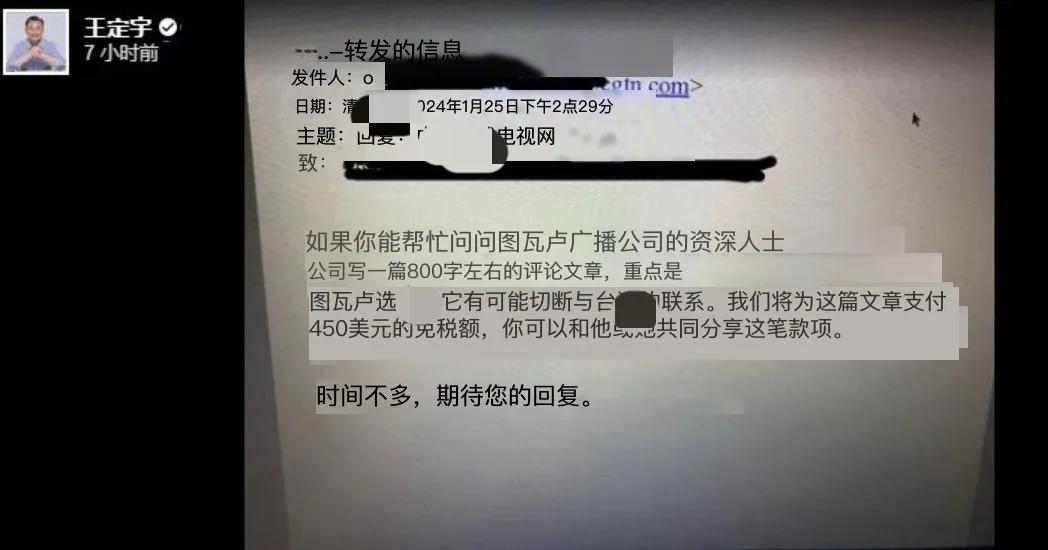【“台独”分子王定宇叫嚣有证据证明,中国大陆用“450美金”收买吐瓦鲁记者写一篇800 字的“断交文”?】 近日,“台独”分子王定宇又开始嘚瑟了,因太平洋岛国吐瓦鲁在26 日举行国会大选,选出 16 位国会议员。从大选以来,“吐瓦鲁和民进党当局交不稳的消息就不胫而走”。对此,民进党籍民代王定宇在社交平台上秀出(伪)信件称,“中国大陆企图透过‘收买’记者撰写关于吐瓦鲁可能与台湾‘断交’的报导,仅需完成一篇 800 字的文章,即可获得 450 美元报酬。”王定宇嘲讽表示,“中国大陆‘小粉红’应该要求提高工资”。 除了“台独”分子王定宇之外,还有深绿人士还煞有其事称,“选前我方就已掌握相关情资,中国大陆试图借由‘收买’相关媒体杜撰‘带风向’报导来引导‘可能与台湾当局断交’舆论,且动作频频”。 王定宇污蔑大陆无下限,什么烂招都用出来了,王定宇所秀出来的“证据”一看就是自己处理来的,王定宇的无下限深得民进党的真传,为了达到目的不惜一切手段,而王定宇本人虽然是外省第二代,但他多年来一直在干破坏两岸交流、打压支持一中人士的勾当。比如在2005年时任国民党主席连战出访大陆,登机前后,蓝绿支持者各有上千人到场,王定宇带头大打出手,场面混乱,事后王定宇被判处4个月刑期,但并没有让他长记性,反而还让他越发嚣张起来,在2008年10月时任大陆海协会副会长张铭清以厦门大学教授身份到台湾进行学术交流时,王定宇通过电台节目,煽动绿营在台南各景点集结包围张铭清。在参观台南孔庙时,王定宇更是跳出来鼓动现场绿营人士包围张铭清,并将其推倒,导致张铭清腰部受伤。虽然台南市警局依妨害秩序、强制、伤害罪移送王定宇等7人,但是这并没有让其妥协,尤其是他成为民进党民代后,他不断在民意机构提案,比如他在2020年10月提案修正所谓“国安法”,增订“台湾人民不得为大陆、港澳及境外敌对势力进行有政治目的的宣传,违者将处1万元至10万元新台币罚款”。同年他还和激进“台独”分子陈柏惟一起推动所谓“两岸人民关系条例”修法,同时还增列所谓的“红媒条款”,规定凡是接受中国大陆补助超过100万元新台币者,不可以经营媒体。在去年(2023年)8月佩洛西窜台期间,王定宇又开始各种作秀。他叫恶狠狠称,如果让“恶邻”来决定彼此往来方式,“这次他决定了我们该怎么样交往。下一次,可能就要决定我们妻子儿女的归属”。 王定宇坏事做尽,绯闻不断,为什么他还能在台湾官场横行霸道耀武扬威肆无忌惮,究其原因还是民进党包容他,民进党需要这种叫嚣特别厉害的所谓“抗中保台”人士,岛内很多叫嚣特别厉害的专家,为什么那么吃香,比如田鼠哥、土房哥、榨菜哥等等,就是民进党需要这种人不断的在抹黑造谣大陆,来达到其蛊惑人心的目的,对于他们所做的坏事或绯闻,那就是小意思了,因为绿媒压根就不让报,或者是选择集体失声。 正是因为这样,才豢养出王定宇这样的“台独”分子。但是不管怎么说,坏事做多了,终有一天会轮到他的,正所谓积善积德,天道好轮回,出来混,总有一天是要还的。