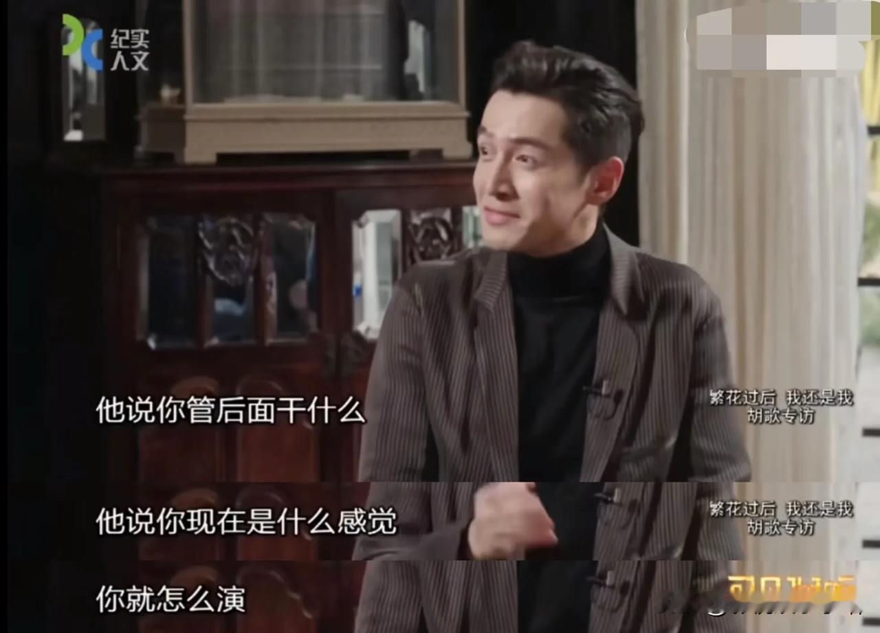 胡歌 :导演,我和三个女性,后面是怎么发展的? 王家卫:你管后面干什么?你现在是什么感觉就照什么感觉演。 胡歌:啥感觉? 王家卫:你喜欢吗?你喜欢就演喜欢,不喜欢就演不喜欢! 胡歌说因为没有剧本,拍的时候根本不知道怎么演,唯一的导航就是导演,导演只给了他一个大的概念: 1、不要把它局限在爱情里面,把那个“情”字去掉,这是一个爱,一个大爱,大爱是包含了很多的感情。 2、你要清楚你们当时身处的那个时代,那个时代的人,他们每天想得更多的是怎么样去抓住时代的机遇,去赶上那个浪潮。 哈哈哈,想起了抖音上的经典评论:王家卫没有告诉胡歌,宝总到底爱谁,但是在代入宝总的过程中,他都没意识到自己不自觉把天平偏向了汪小姐,或许,这是人物自我意识的觉醒,也是胡歌对唐嫣的偏爱! 王:你喜欢就喜欢 ! 老胡:懂了!
