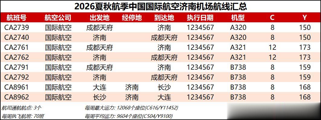 11 中国国际航空 新航季国航在济南的航线没有变化,因为排班的机型略微改小所以份额略降,当然排班的机型不等于实际执飞,不知道国航的济南-天府还能不能混上老330来飞几班。