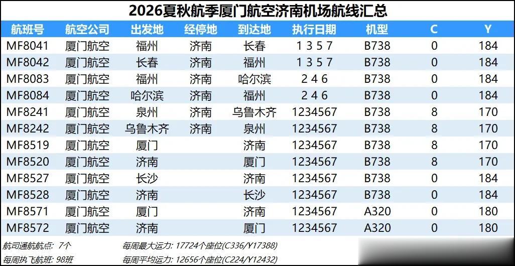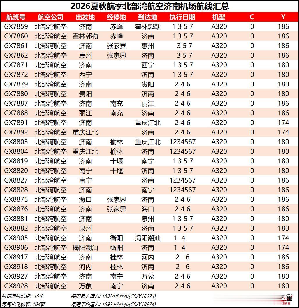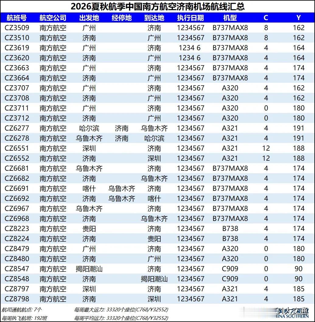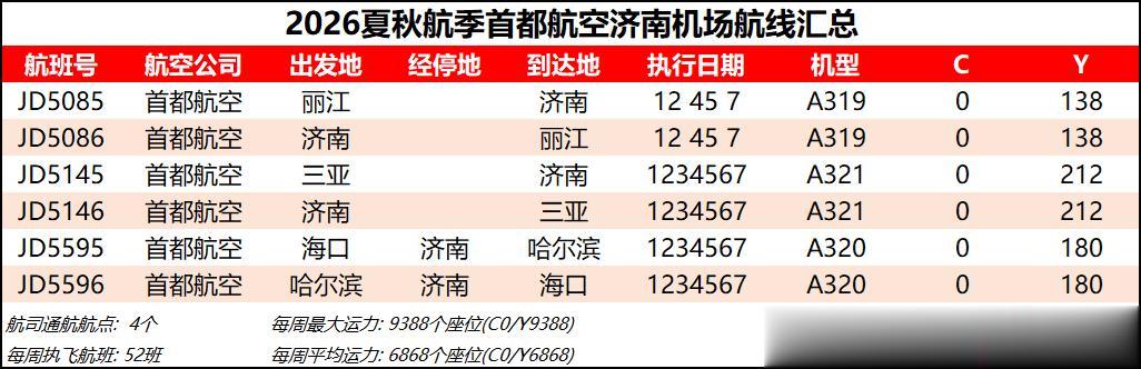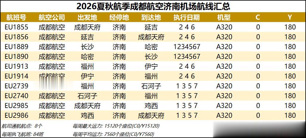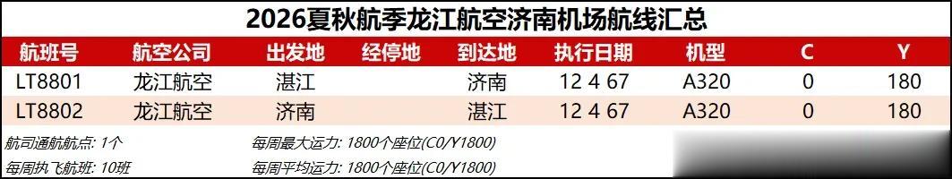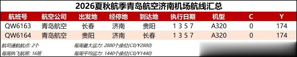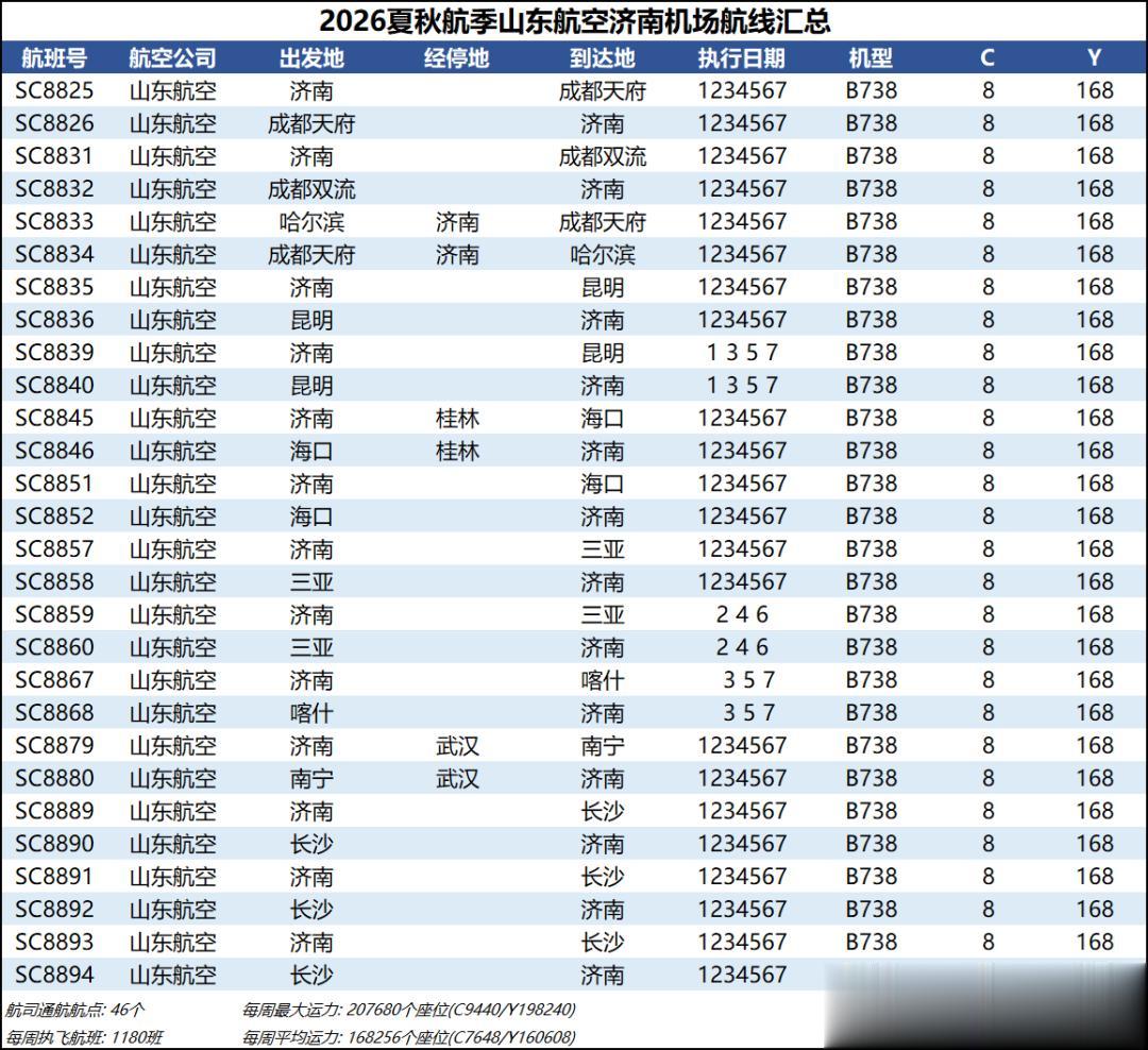 综合数据来看,2026夏秋航季济南机场的平均运力同比2025夏秋航季下降约1%,周航班数量也是跌到了3000班以下,过夜飞机仍维持40架【东航减少一架、北部湾增加一架】。本航季济南机场平均运力已连续3个航季出现同比负增长,主要还是受到经济形势和国际局势的影响吧,近两年除了几座头部机场还能保持正增长,二三线机场普遍增长乏力甚至出现客流负增长,民航机队规模增速也显著放缓。