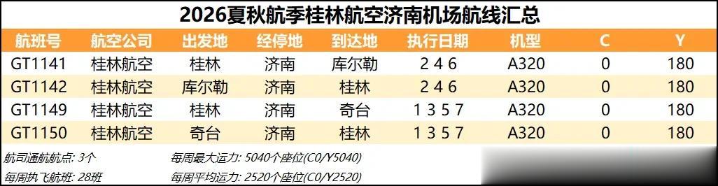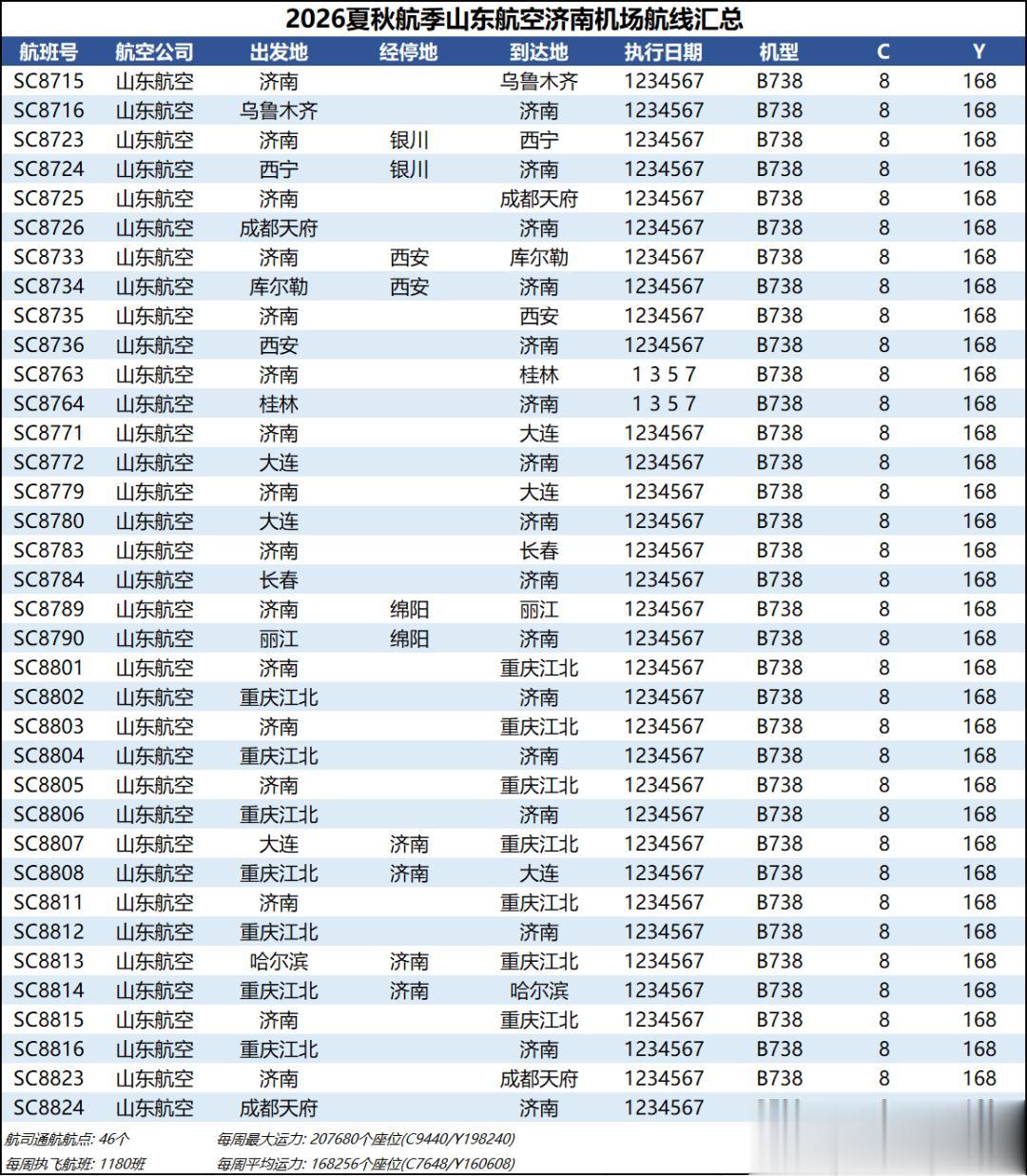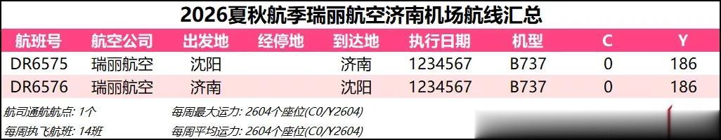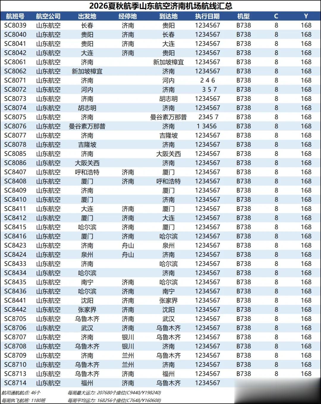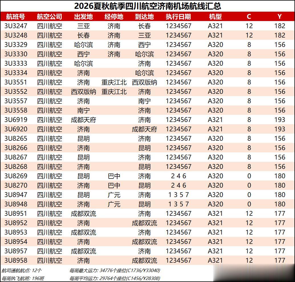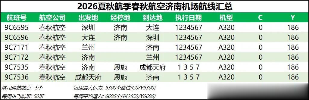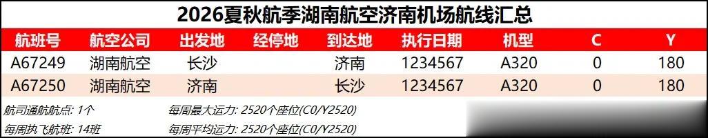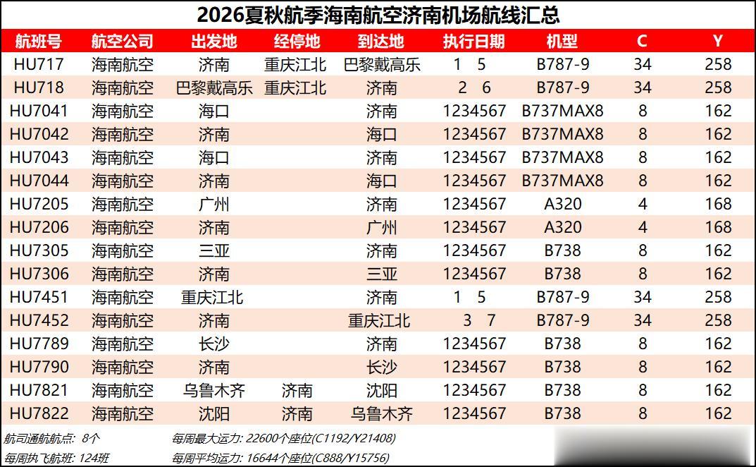 综合数据来看,2026夏秋航季济南机场的平均运力同比2025夏秋航季下降约1%,周航班数量也是跌到了3000班以下,过夜飞机仍维持40架【东航减少一架、北部湾增加一架】。本航季济南机场平均运力已连续3个航季出现同比负增长,主要还是受到经济形势和国际局势的影响吧,近两年除了几座头部机场还能保持正增长,二三线机场普遍增长乏力甚至出现客流负增长,民航机队规模增速也显著放缓。